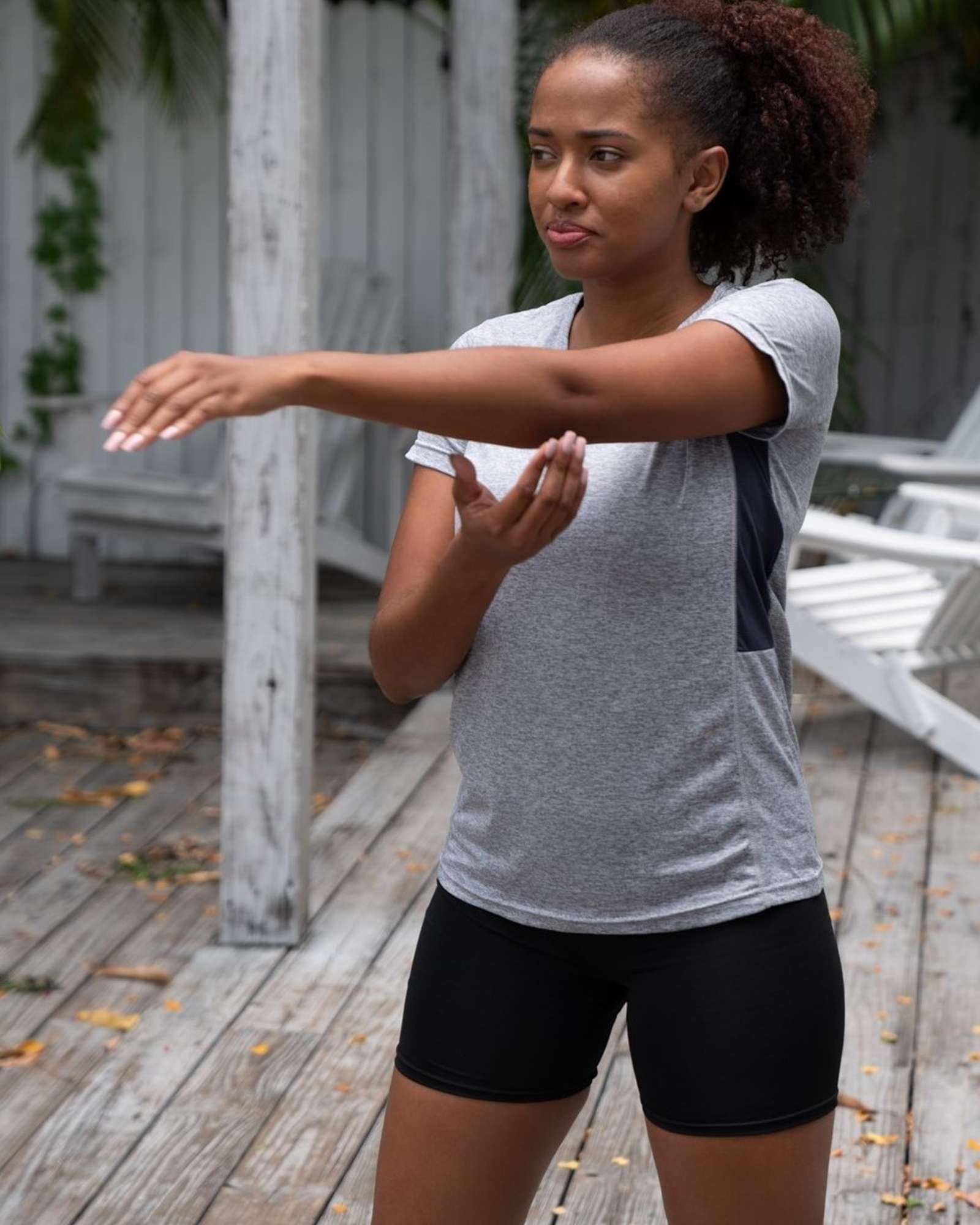 So, if you’re headed to a 60-minute yoga class or running a cross-country race, you’ll feel cool, comfortable, and dry in our workout Tee.