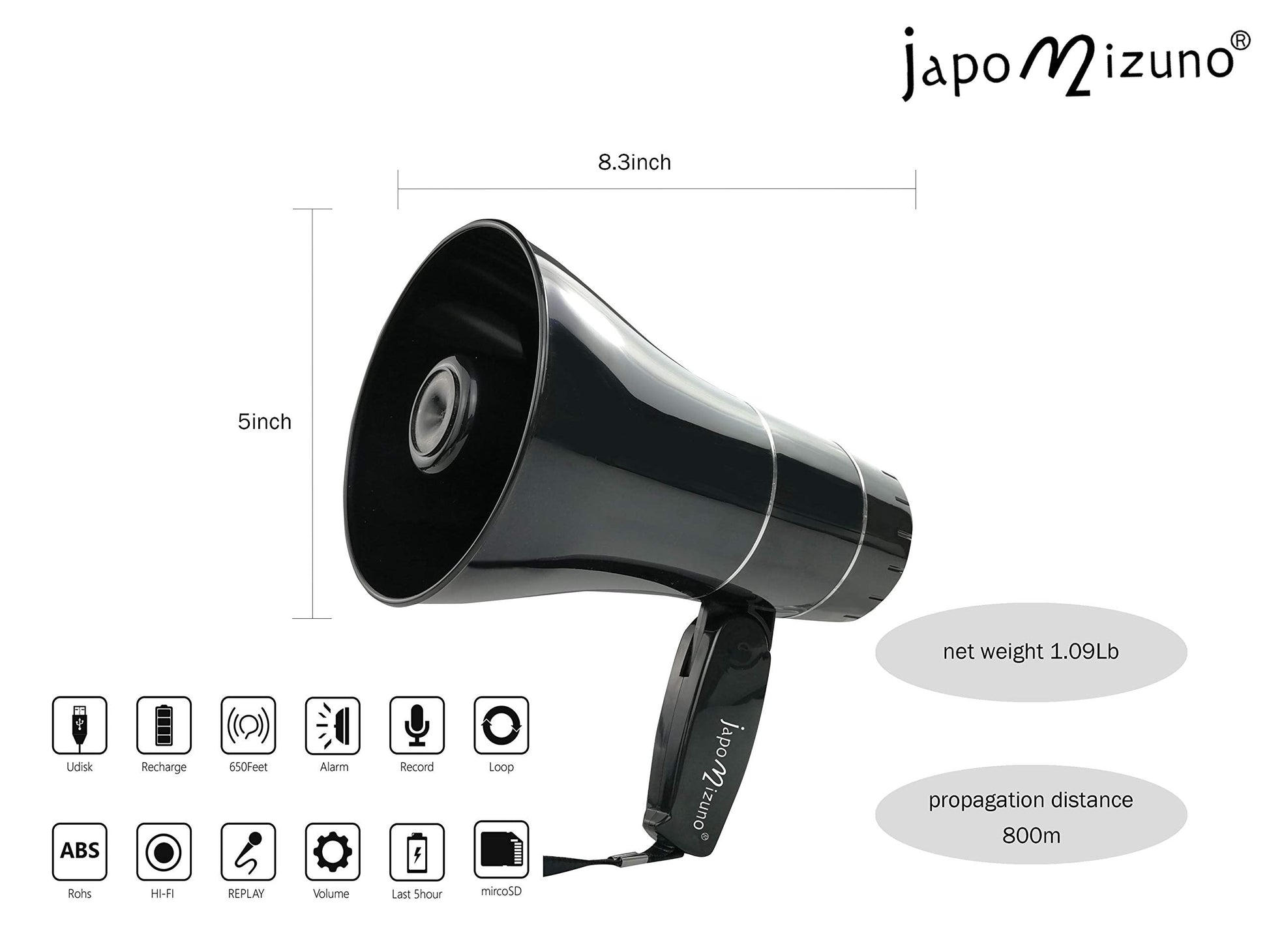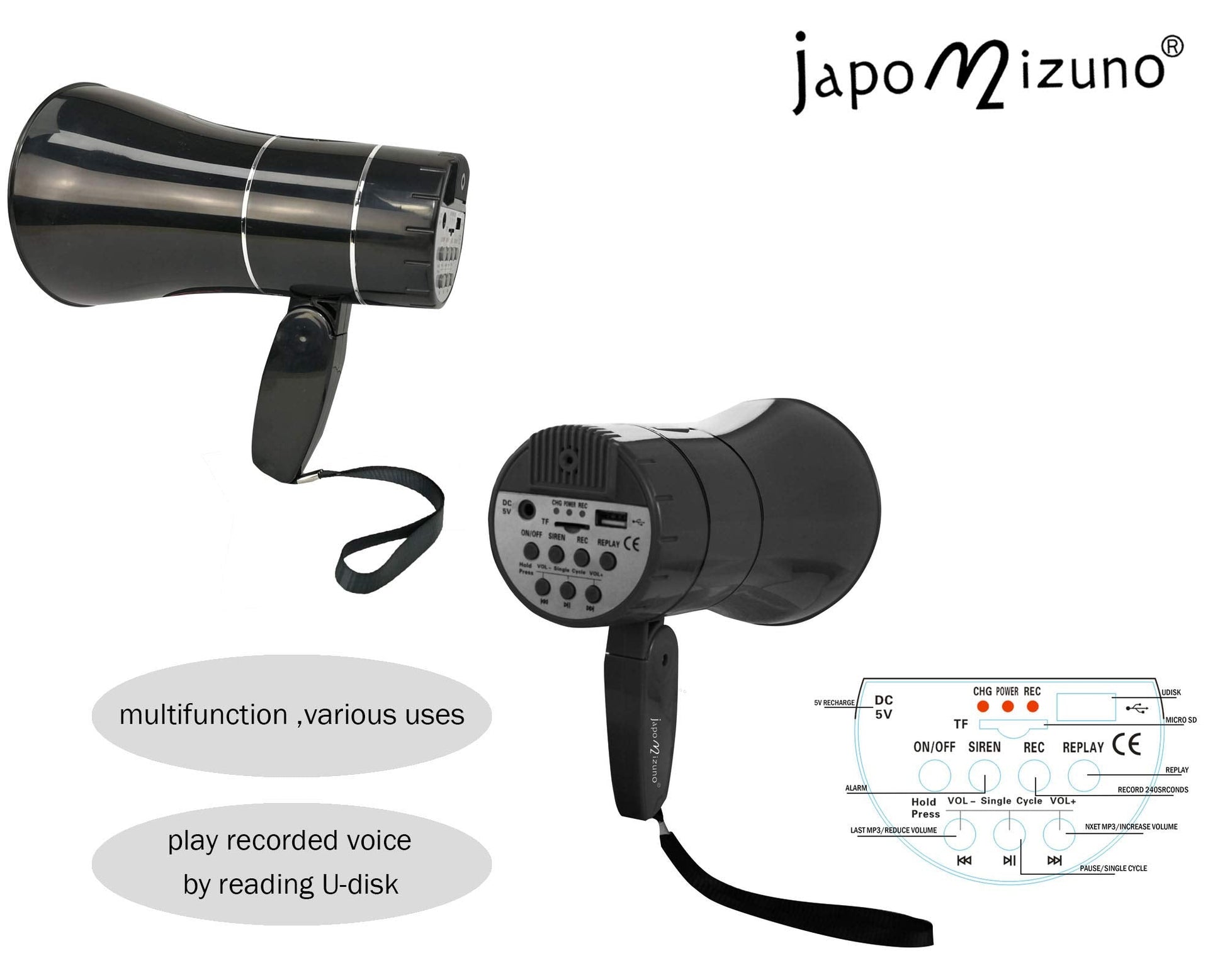 Rechargeable Bullhorn Megaphone Speaker with 240s Recording, Emergency Siren Alarm, U-Disk Playback Portable PA System for Outdoor Events, Coaching, Stadiums Rechargeable Battery Included (Black)