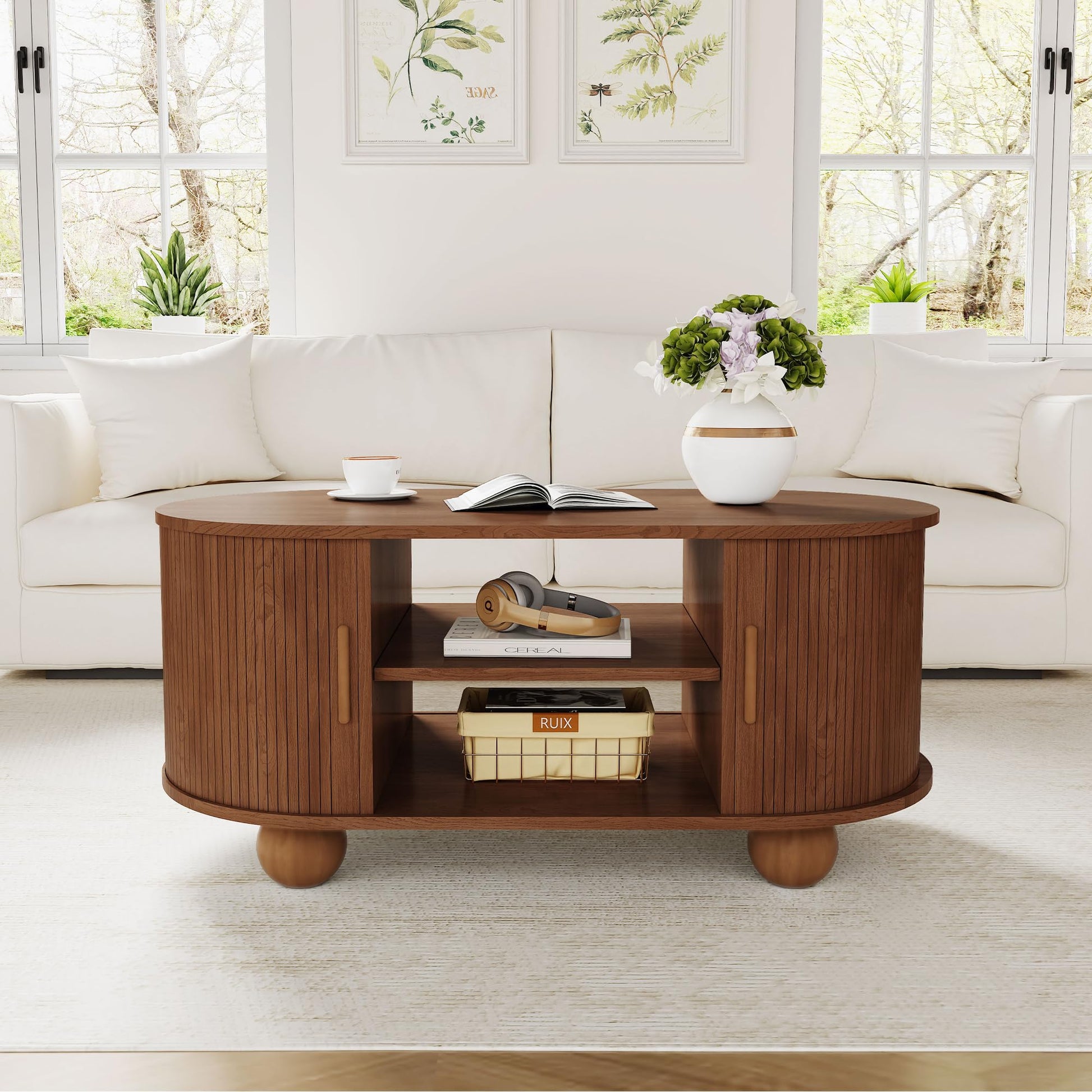 Rectangle Coffee Table, Mid-Century Modern Coffee Table with Storage & Sliding Doors, Fluted Coffee Table Center Table for Living Room, Dining Room, Apartment, Home Office (Walnut)