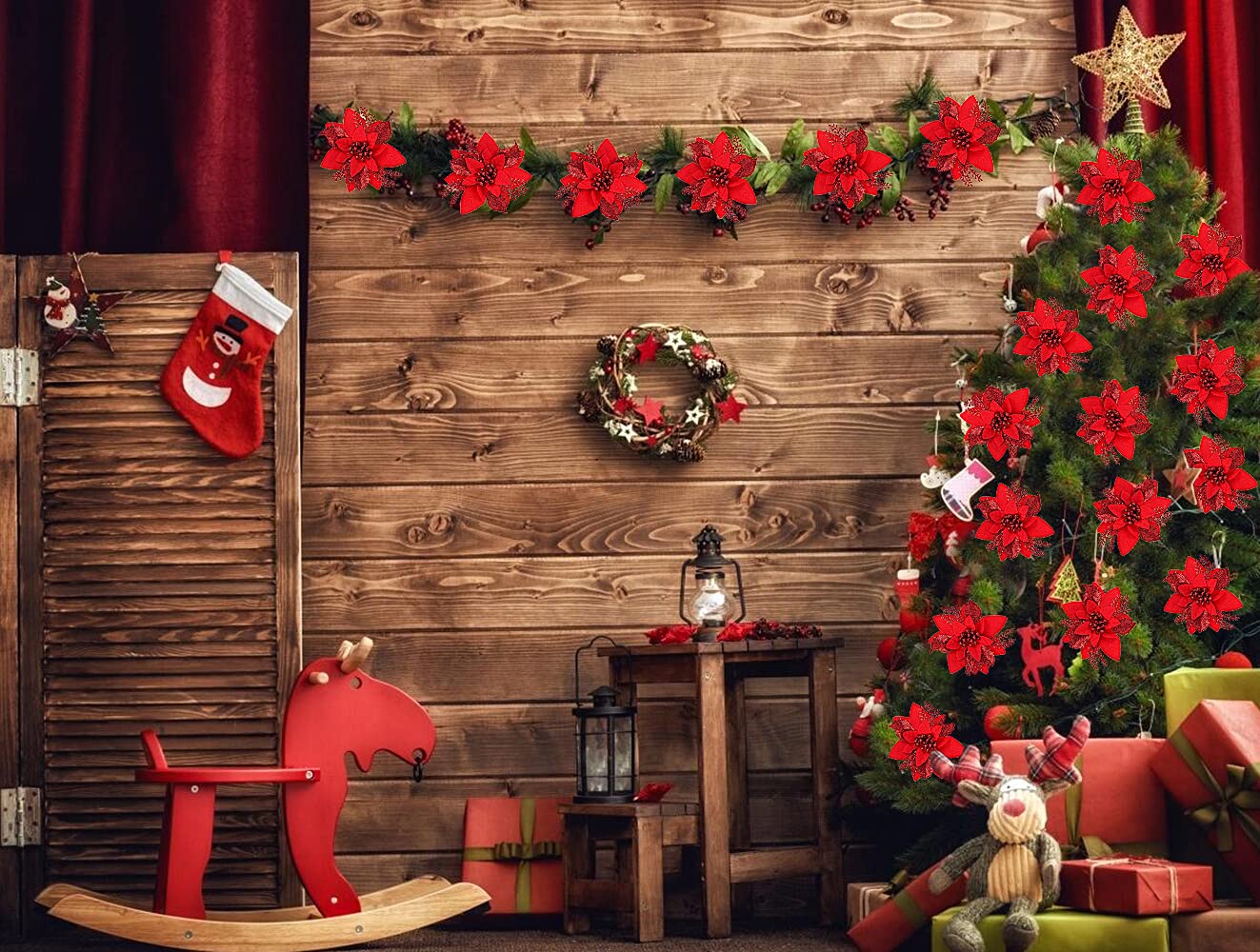 - 【Glitter Flower Noted】The Christmas glitter poinsettia flowers are full of glitters.Due to long distance transport, some glitter powder will drop from flowers and these Christmas flowers may be a little extrusion or deformation,that is normal! That would not affect exterior looking! Hope for your kindly understanding!