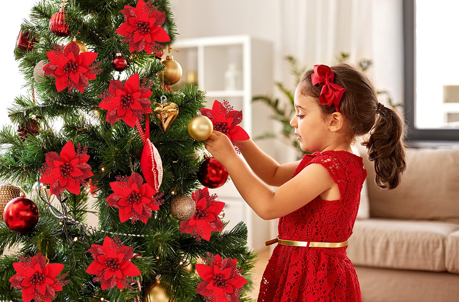 - 【10 Pack Christmas Glitter Poinsettia Flower】Each poinsettia flower size is appr. 6' in diameter and each Christmas poinsettia flower with many glitter powder, sparkly, gorgeous. The Christmas flowers are flat and not easily deformed.Adding a little bling and shine to your Christmas tree.Note: There are 10 stems and 10 clips on the product, no need to purchase other accessories.
