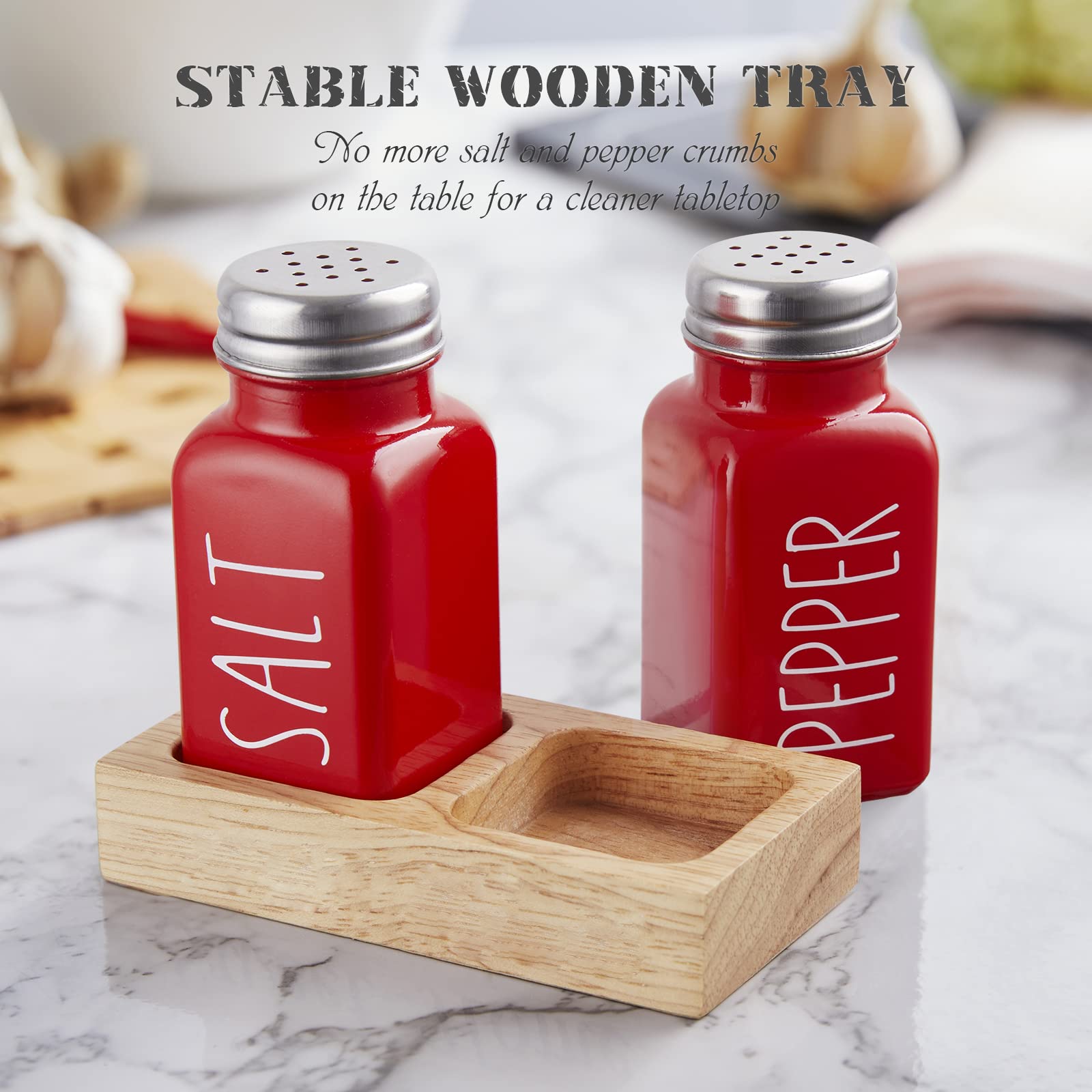 Red Salt and Pepper Shakers Set with Holder - Dopeca Glass Salt Shaker with Wood Tray for Kitchen Counter - Red Kitchen Decor and Accessories - for Christmas Kitchen Housewarming Gift - 2.7 oz