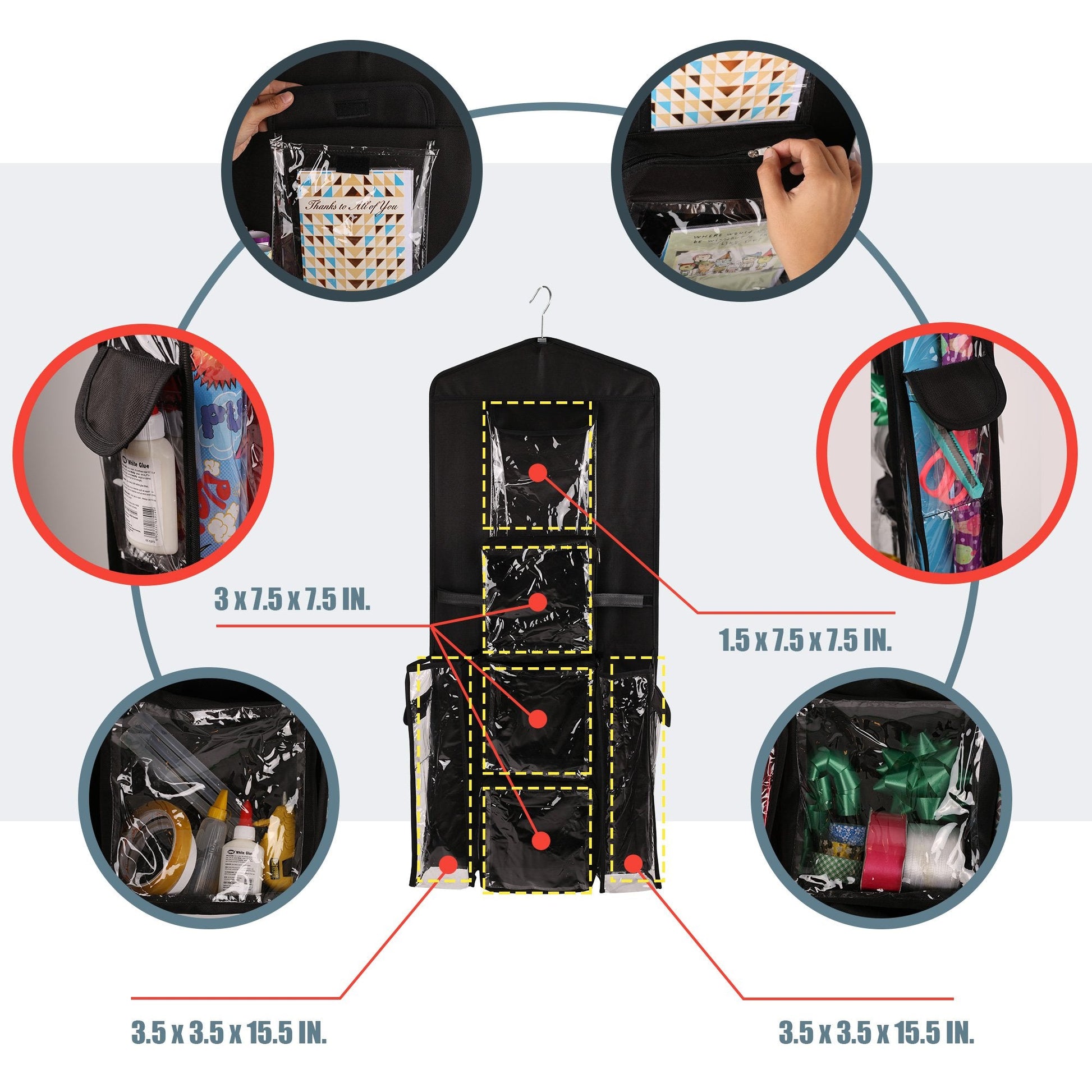 - EASY TO USE. The dual-sided hanging organizer is 40''x 16''. It is lightweight and can be hung in no-time. This high-quality product can be used to store a variety of gift-wrap items.