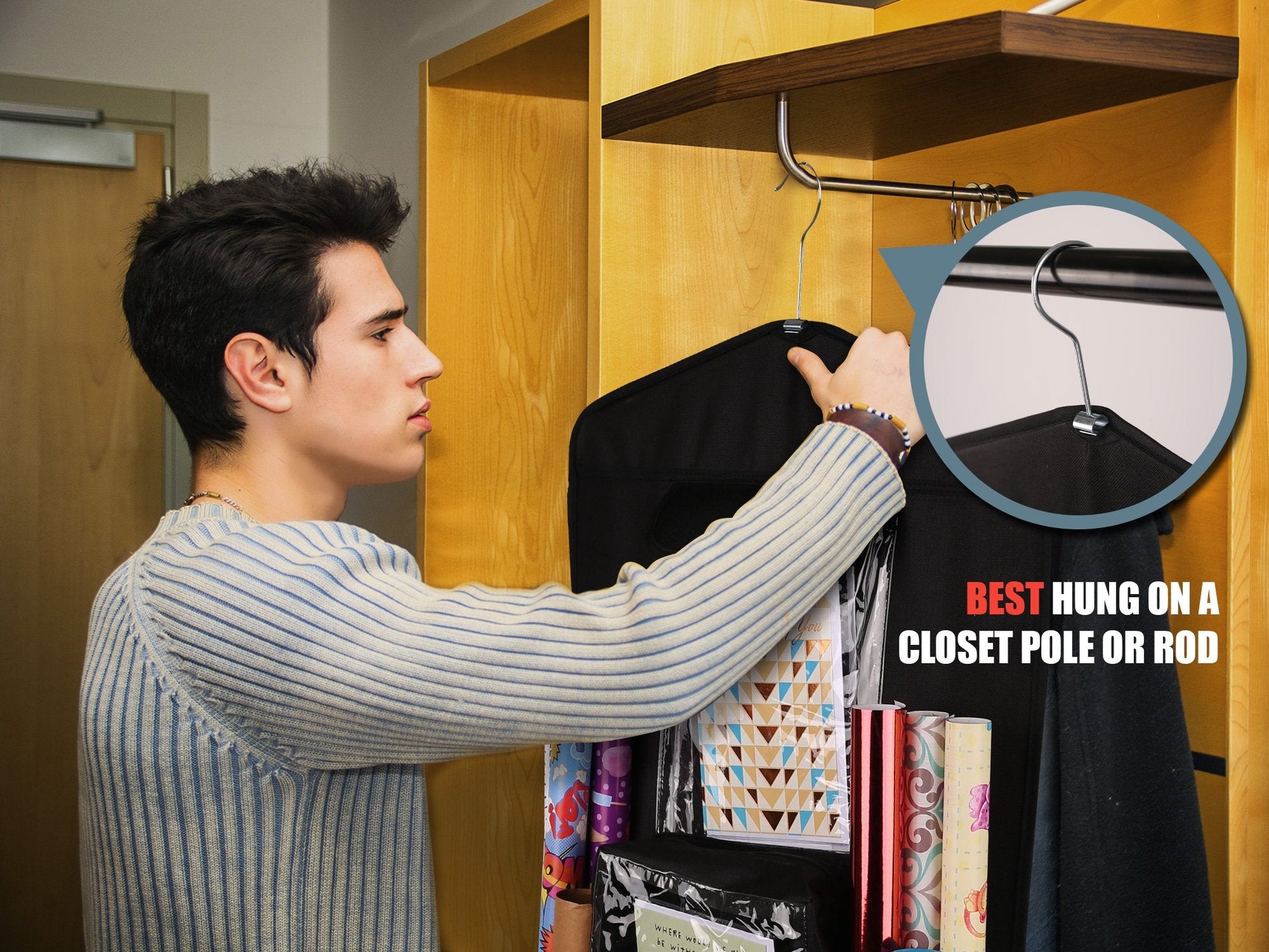- DURABLE. The storage unit comes with a built-in metal hanger which is strong and rotatable. It is designed to fit any standard-size closet rod or pole and can accommodate up to 35 pounds.