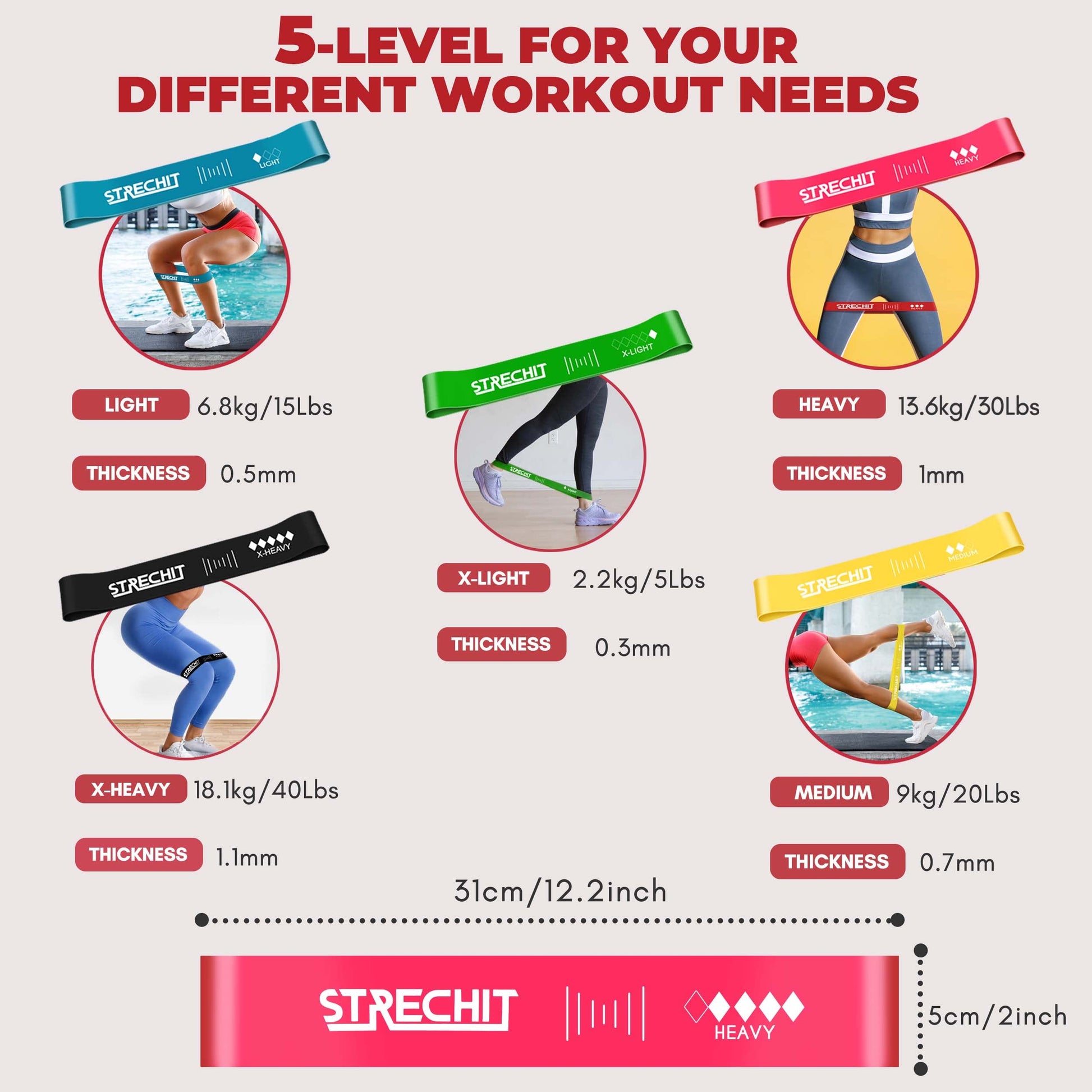 - Your Portable Gym: Widely used Pack of 5 Gym Bands (each 60 x 5cm long) comes in 5 different colours conveying x-Light, Light, Medium, Heavy and x-Heavy strength levels along with a workout guide & a strong carry bag which is handy and keeps the bands clean