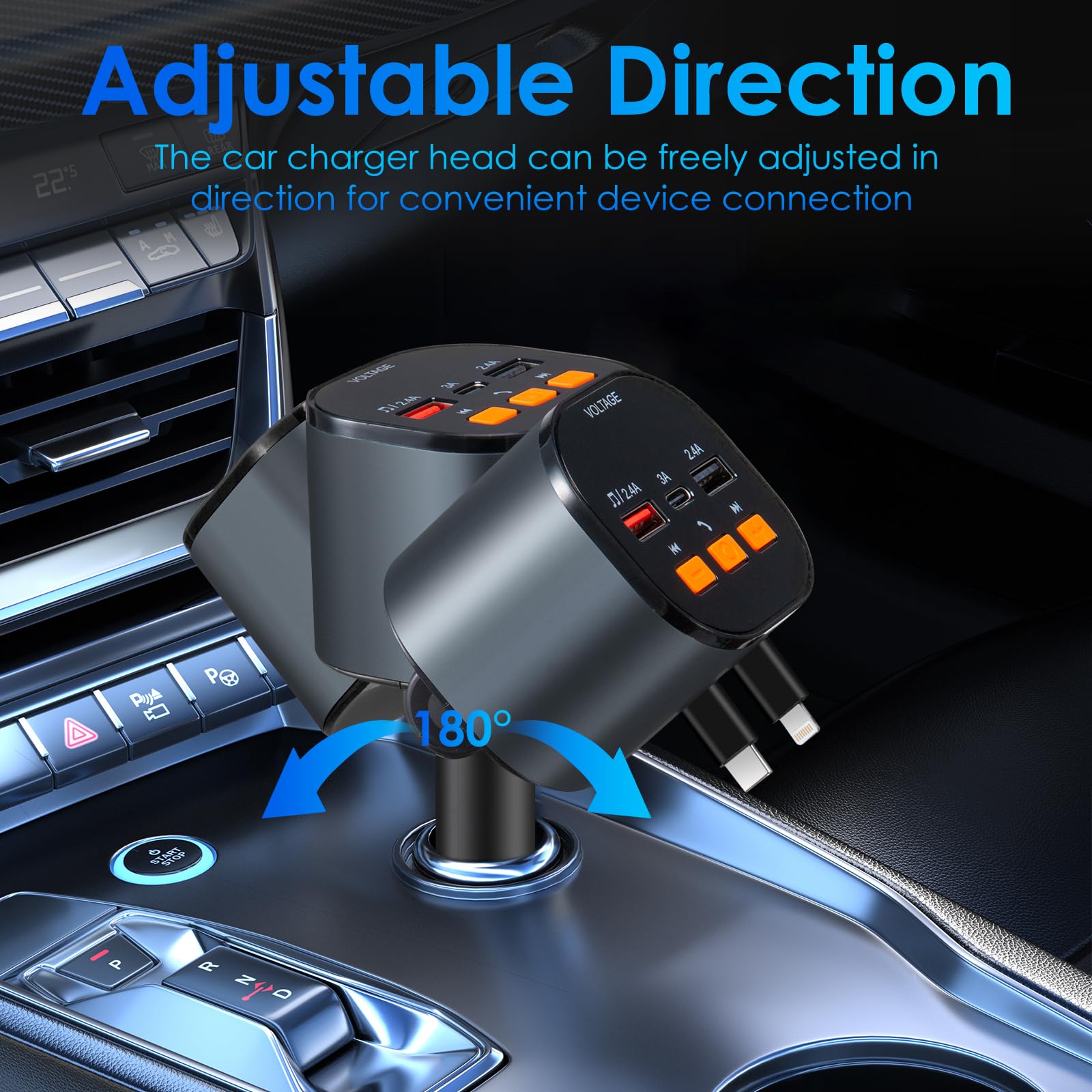 - This 5 in 1 retractable car phone charger can be used for both 12 V DC and 24 V DC. Rated Power: 90 W. Type-C Retractable Cable Output: PD30 W Max. IOS Retractable Cable Output: 5V/2.4A. Type-C Port Output: 5V/3A. USB-A Port Output: 5V/2.4A, compatible with devices supporting PD, QC3.0, AFC, MTK, and FCP including phones, tablets, notebooks, Switch, etc. Be like iPhone 15/14/13/12/11/ Plus/ Pro/ Pro Max/ mini/ XS / XS Max / XR /X /8 Plus/8/ 7 Plus /7 /6S /6, Samsung Galaxy Note 20 Ultra/ Note10 Plus/ S23/S22/S22+/S22 Ultra/S21+/S20/S10 5G /A54/S /S9 Plus/ S8+/ Note 9, Google Pixel7/ 7a/ 6/ 6a/ 5/ 4xl/ 3xl/ 2xl/ 3a/ 4/ 4a/Nexus 6P etc