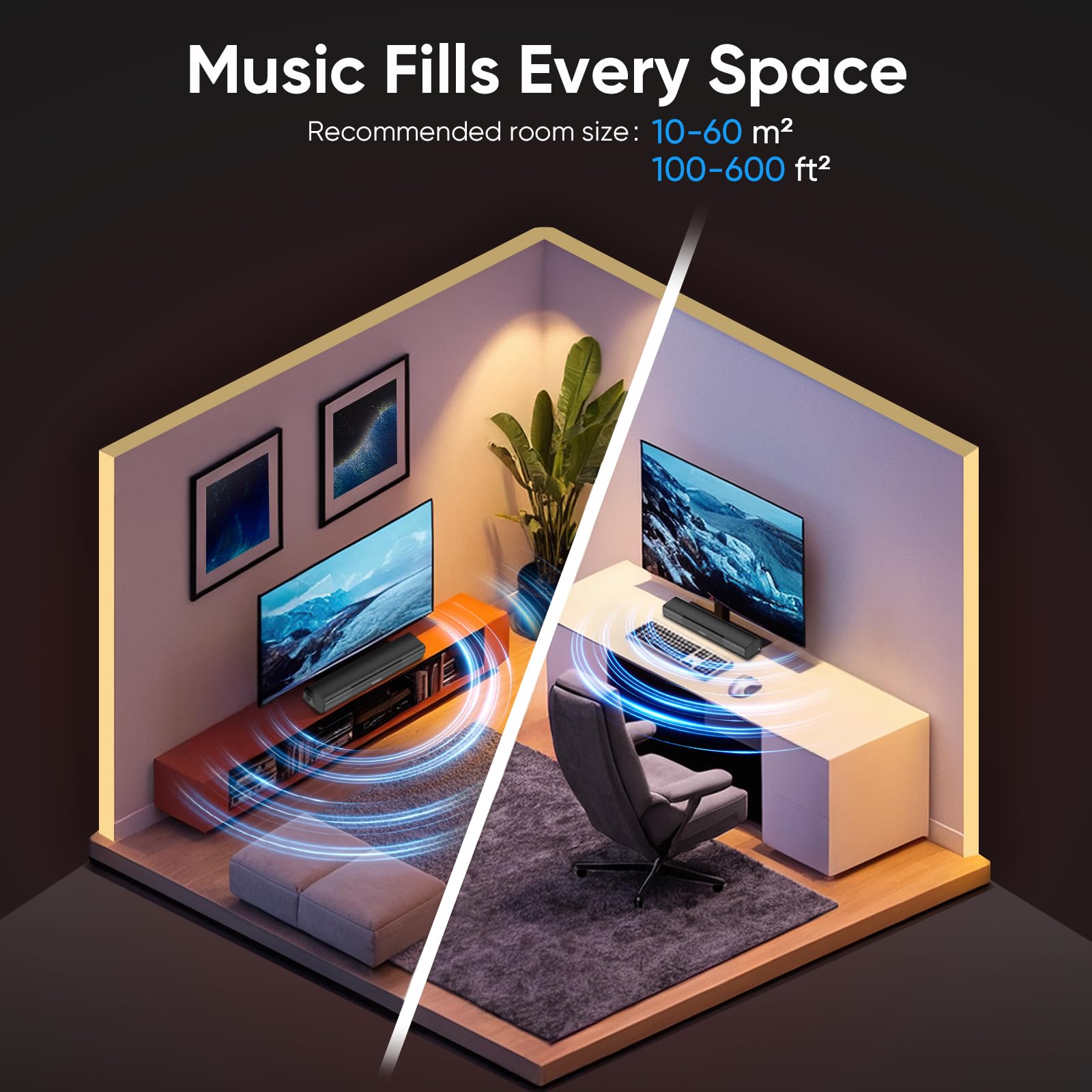 - Immersive Sound with Enhanced Mid & Low Frequencies: Dive into rich, detailed audio with this soundbar's superior mid and bass performance. Great for music rich in rhythm and depth, ensuring every beat is felt.