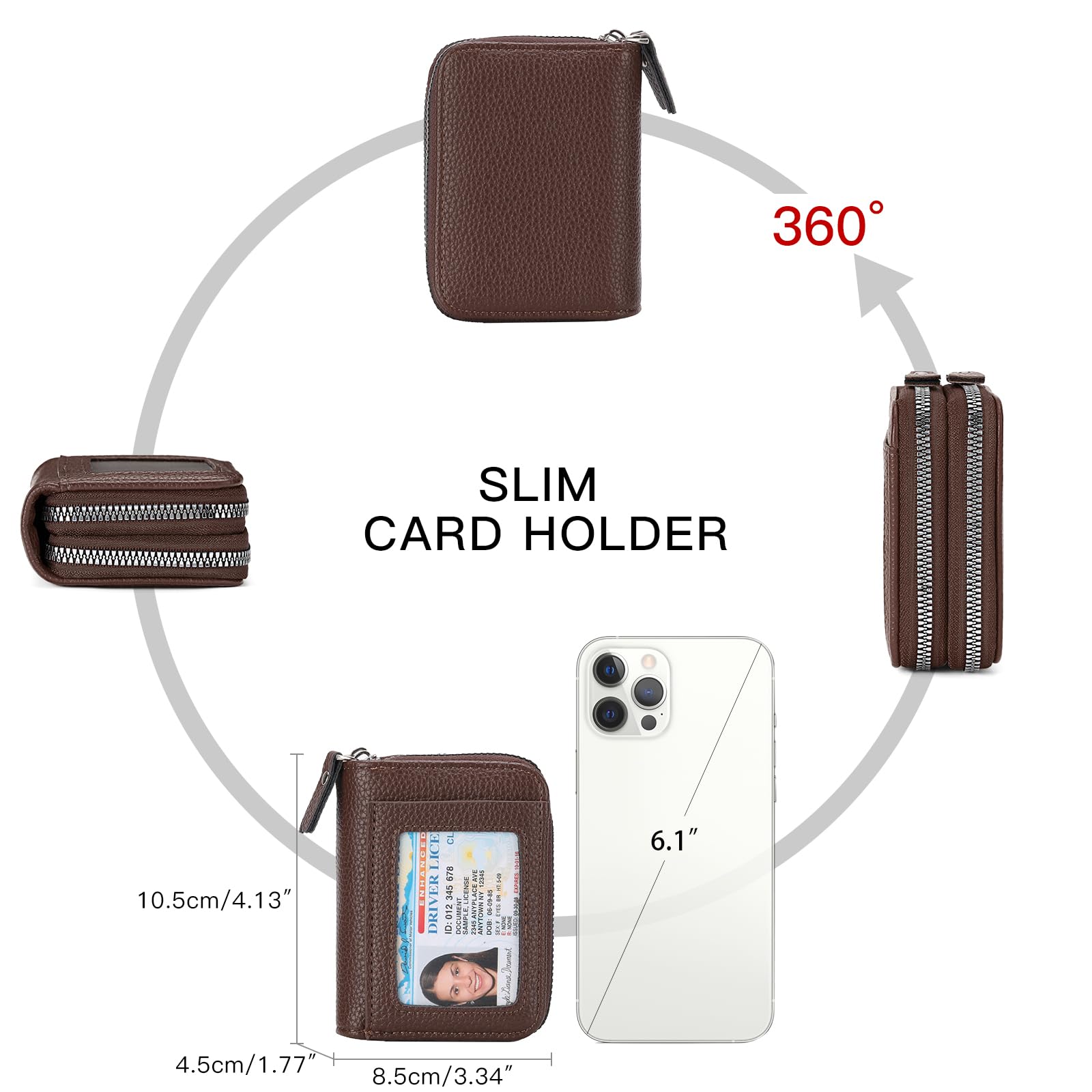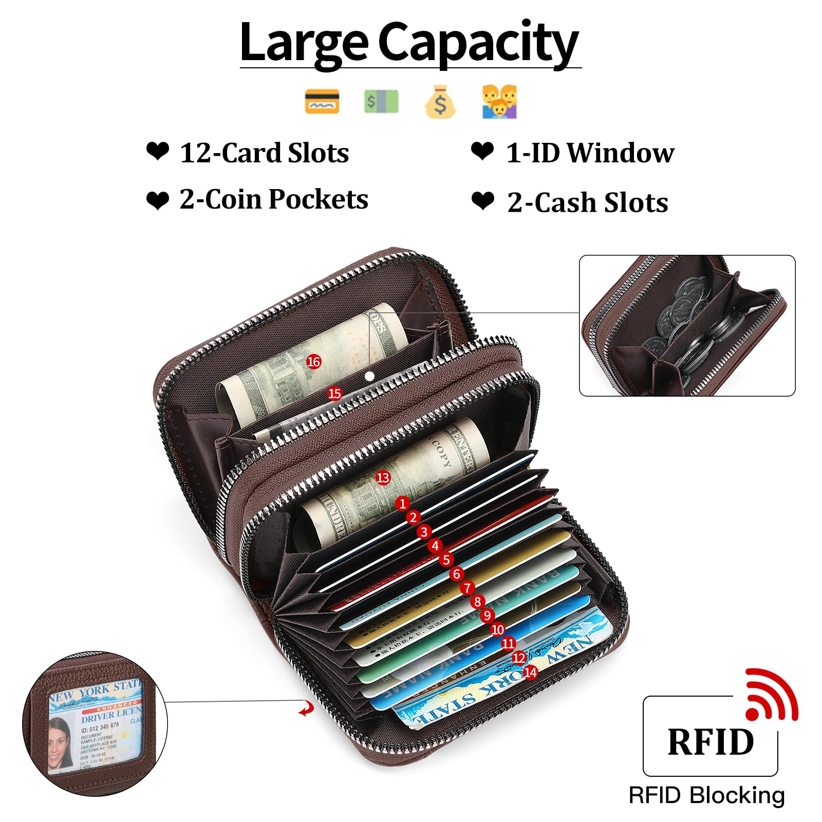 - Large Capacity Card Wallet:Double zipper compartments, one for credit cards or cash, and one for coins or cash. 12 independent credit card slots, each slot can hold 1 or 2 cards, 4 cash slots can store coins or folded banknotes, and 1 ID card window.