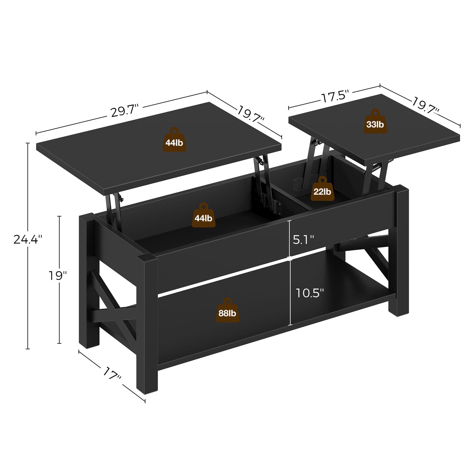 - Large Storage Space: Two hidden storage compartments beneath the top are designed to store your often-used items to keep them handy and free of dirt. The lower open shelf can increase your storage space and keep all your things handy and organized. Product Size: 47.2'W x 19.7'D x 19-24.4'H