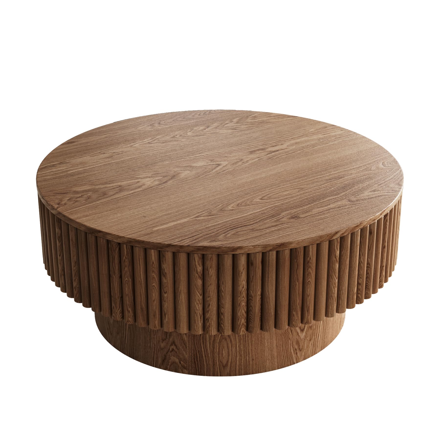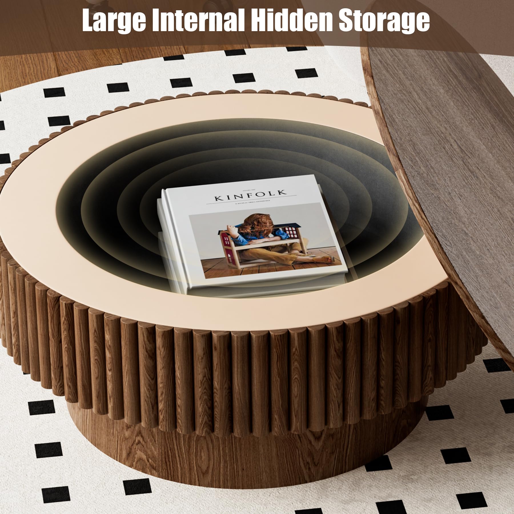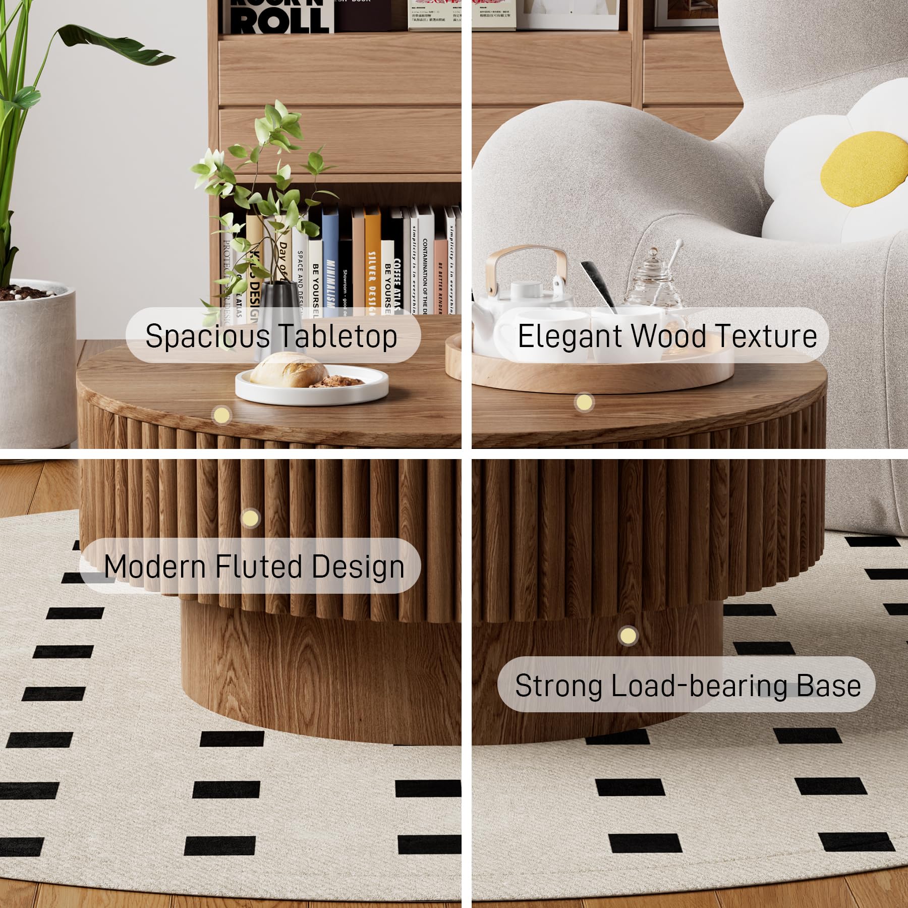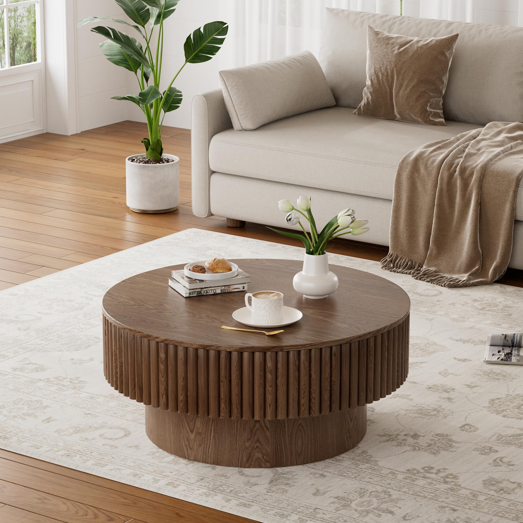 Rophefx Round Coffee Table with Storage, Wood Circle Coffee Tables for Living Room, Fluted Modern Circle Drum Center Tea Tables, ø31.5" x 14"H, Walnut Color