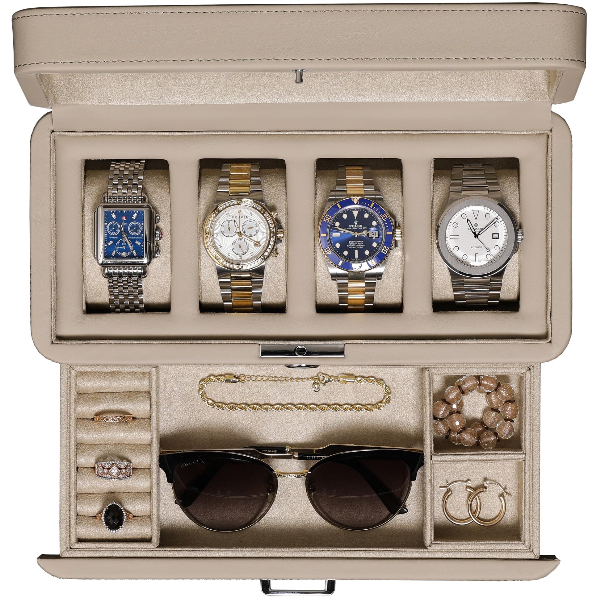 ROTHWELL 4 Slot Leather Watch Box with Valet Drawer - Luxury Case Display Jewelry Organizer, Locking Display Case Holder with Real Glass Top - Watch Box Organizer for Men & Women (Oatmeal)