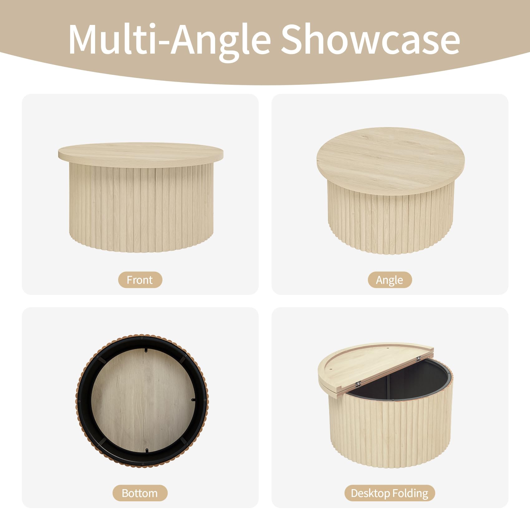 Round Coffee Table with Storage, Wood Modern Fluted Drum Coffee Table with Flip Top, 31.5" Farmhouse Center Table for Living Room, Reception Room, Entertainment Room, Courtyard (1, Oak)