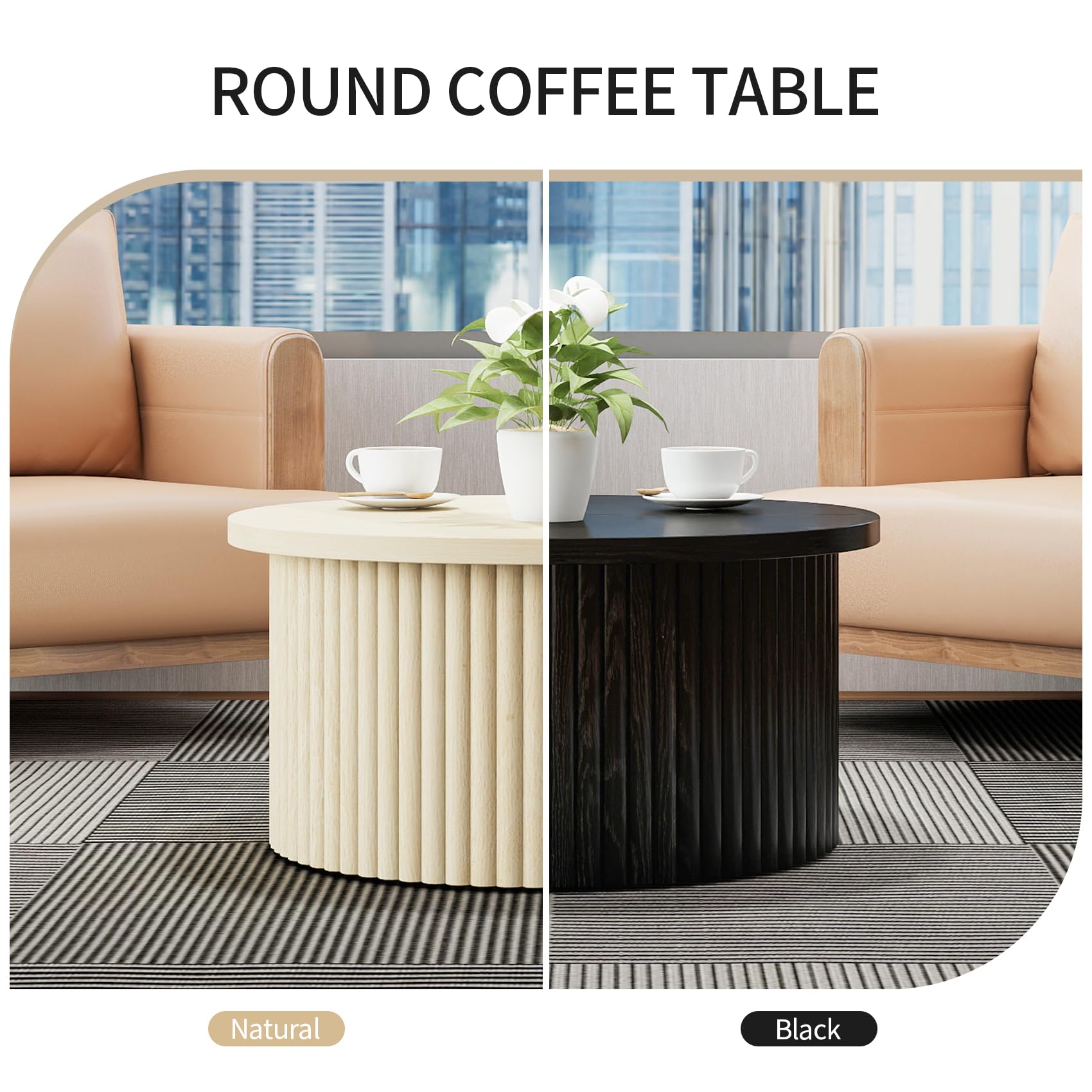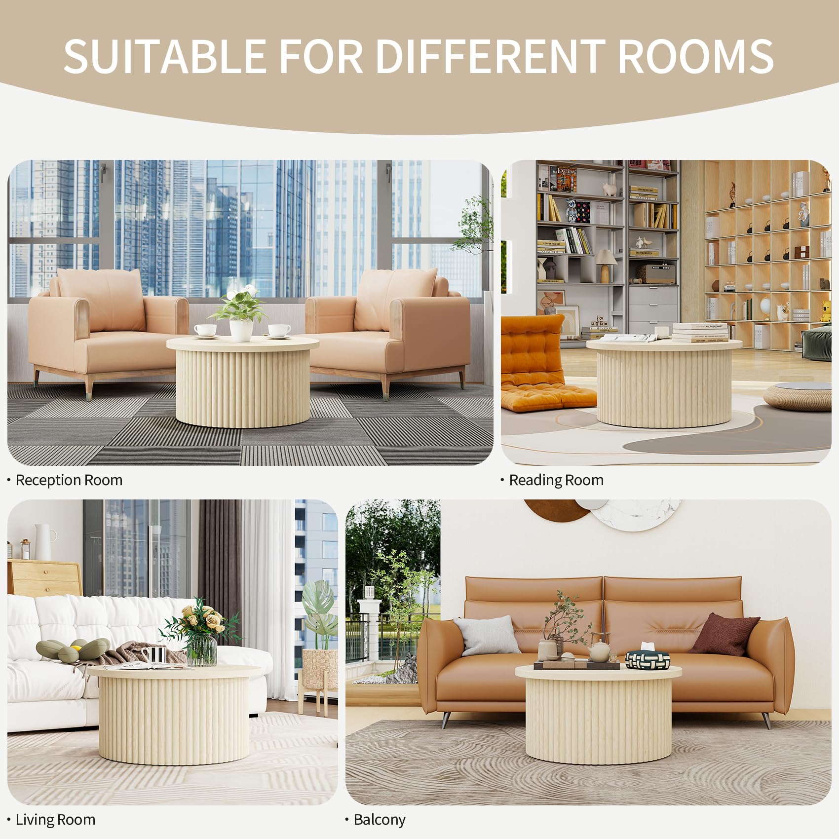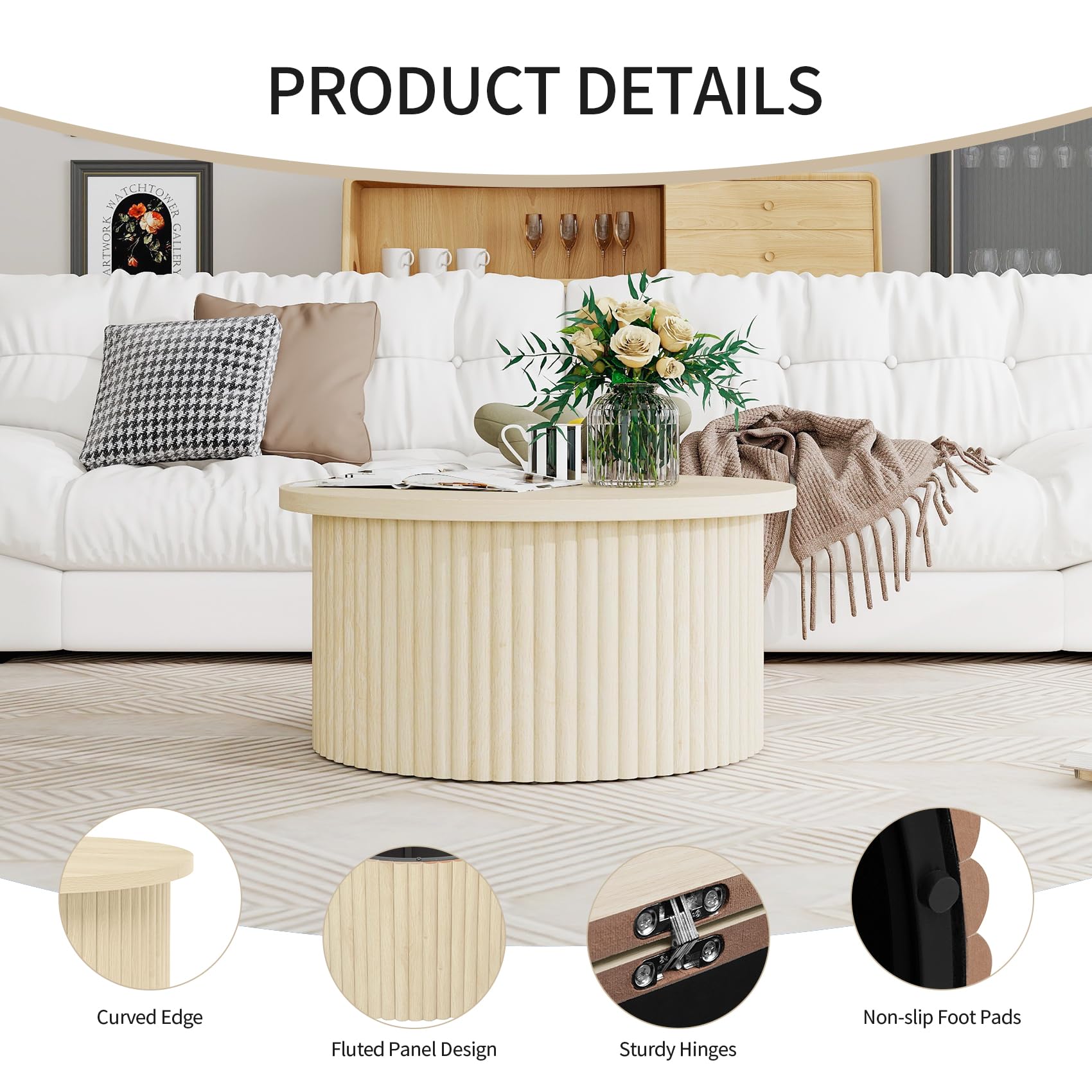 - Durable & Sturdy Structure Crafted from high-density MDF, this wood coffee table resists warping and scratches, ensuring long-term durability. The non-slip foot pads stabilize the living room table on hardwood or carpet, preventing scratches and slips. The fluted panel design not only enhances aesthetics but also reinforces the drum coffee table’s structural integrity.
