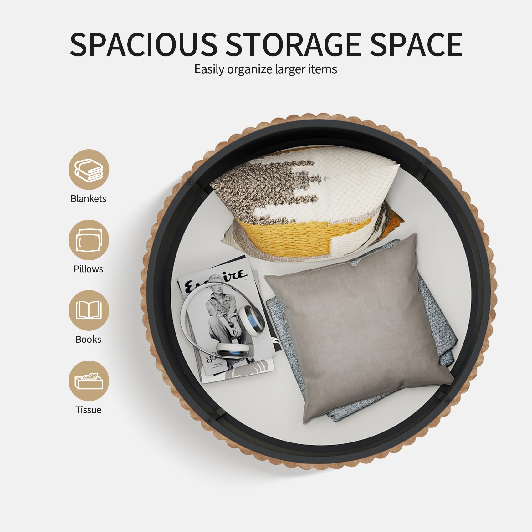 - Multifunctional Use The modern coffee table serves multiple purposes: its flip-top surface can hold up to 88 lbs, doubling as a sturdy desk or display area for decor. The drum-shaped design makes it a versatile center table for living room, suitable for hosting guests or solo relaxation. Its 31.54' diameter provides ample space for drinks, books, or plants, while the round coffee table shape ensures easy movement around furniture.