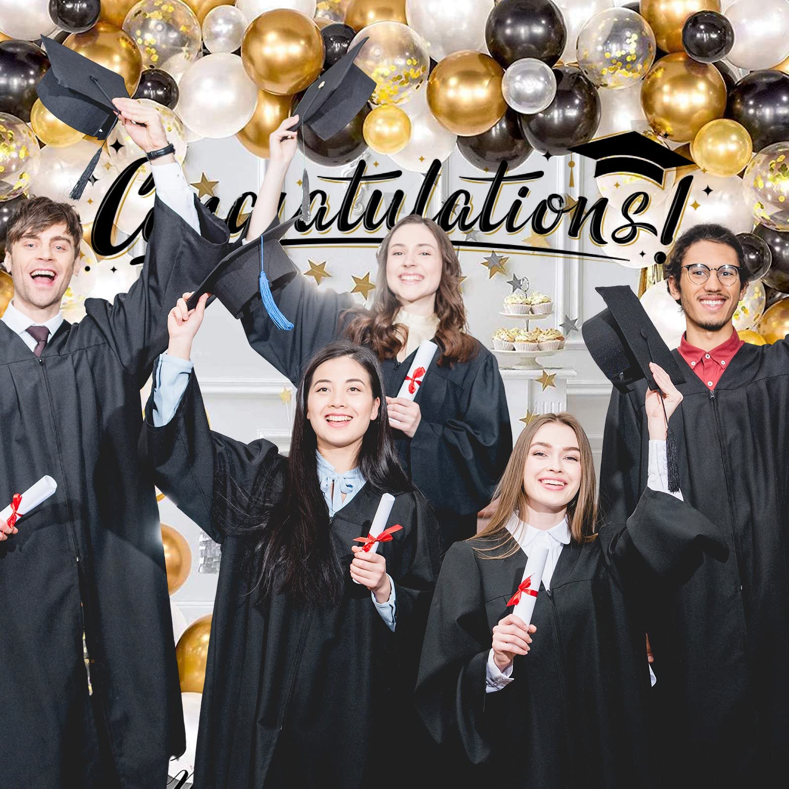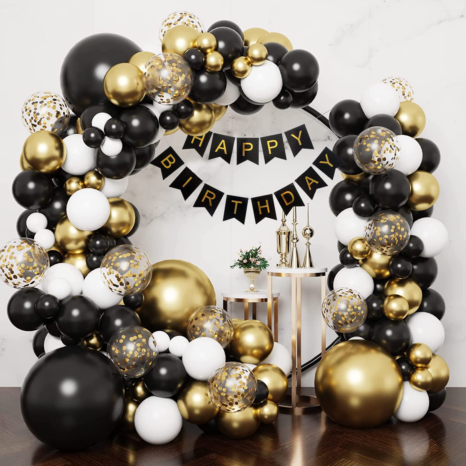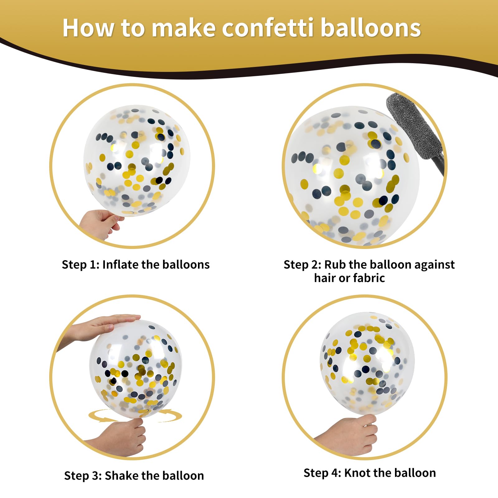 - [All-in-One Kit] This balloon kit includes everything you need to create a stunning decoration, 20 gold balloons, 20 black balloons,15 white balloons, 10 confetti balloons, and 2 rolls of ribbons. The size of the balloon is about 12 inches after inflation. The combination of gold and black adds a touch of glamour to any party.