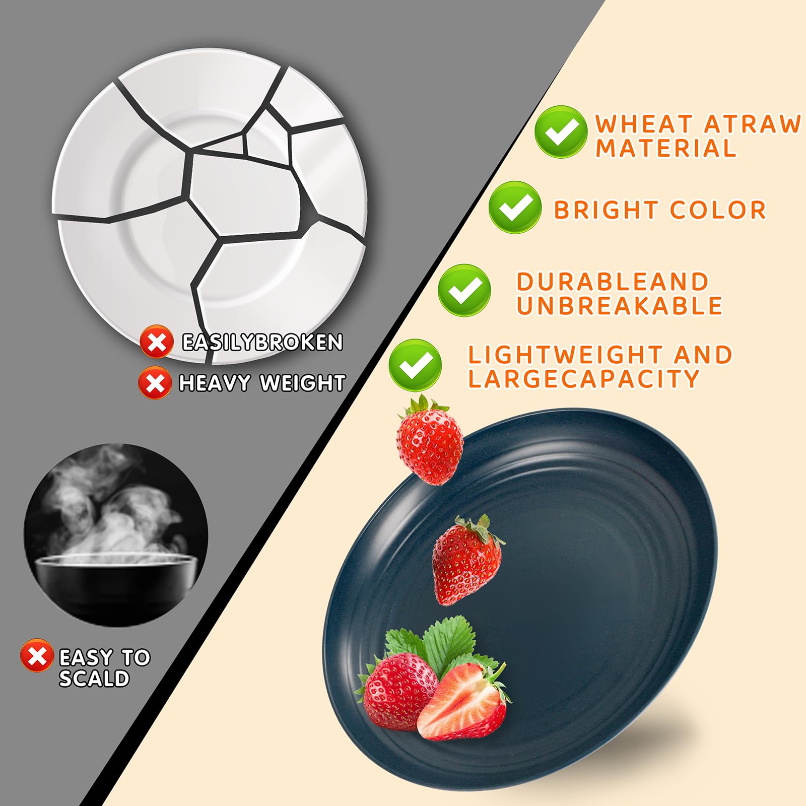 - Safe materials: The wheat straw camping plates set is made of natural straw fibers and food grade safe materials. It is 100% free of bisphenol A and non-toxic. Durable and sturdy, the autumn four-color (Orange, Yellow, Navy Blue, Blue) plastic dinnerware set is very sturdy, durable, lightweight, and unbreakable. It will not break or shatter like porcelain or ceramics, even if accidentally dropped or impacted!