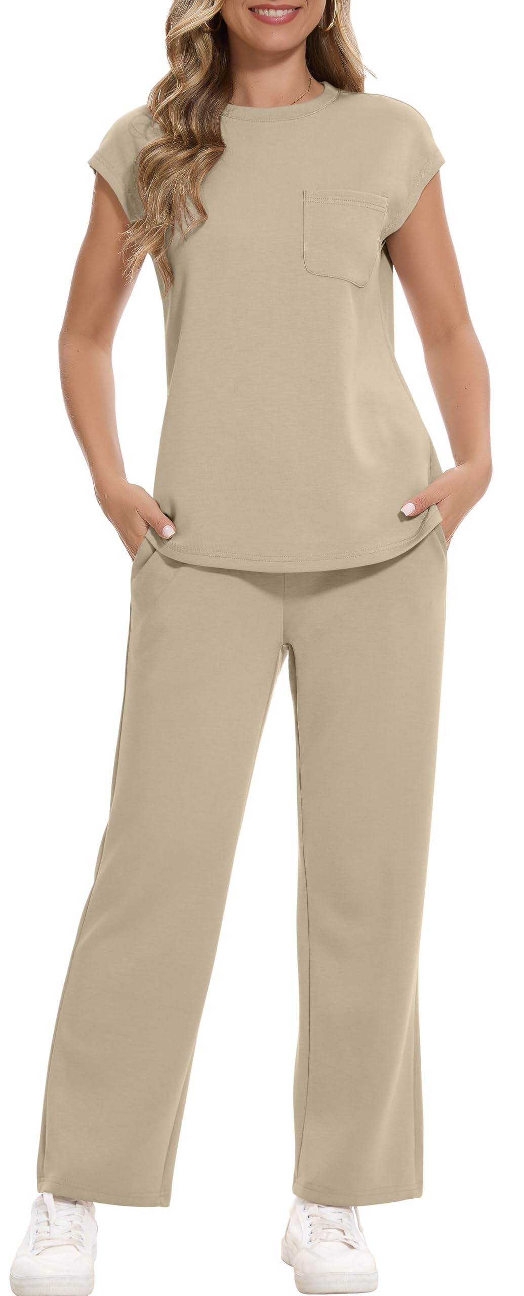 RUBZOOF Lounge Sets for Women 2 Piece Casual Summer Outfits Vacation Traval Clothes Loose Fit Cap Sleeve Tops Matching Pants Set Athletic Workout Sweat Suits Khaki M