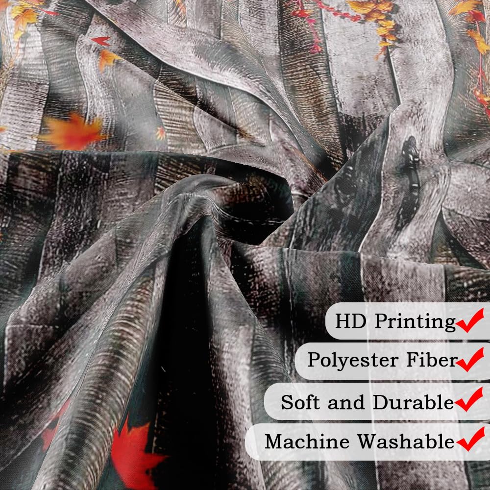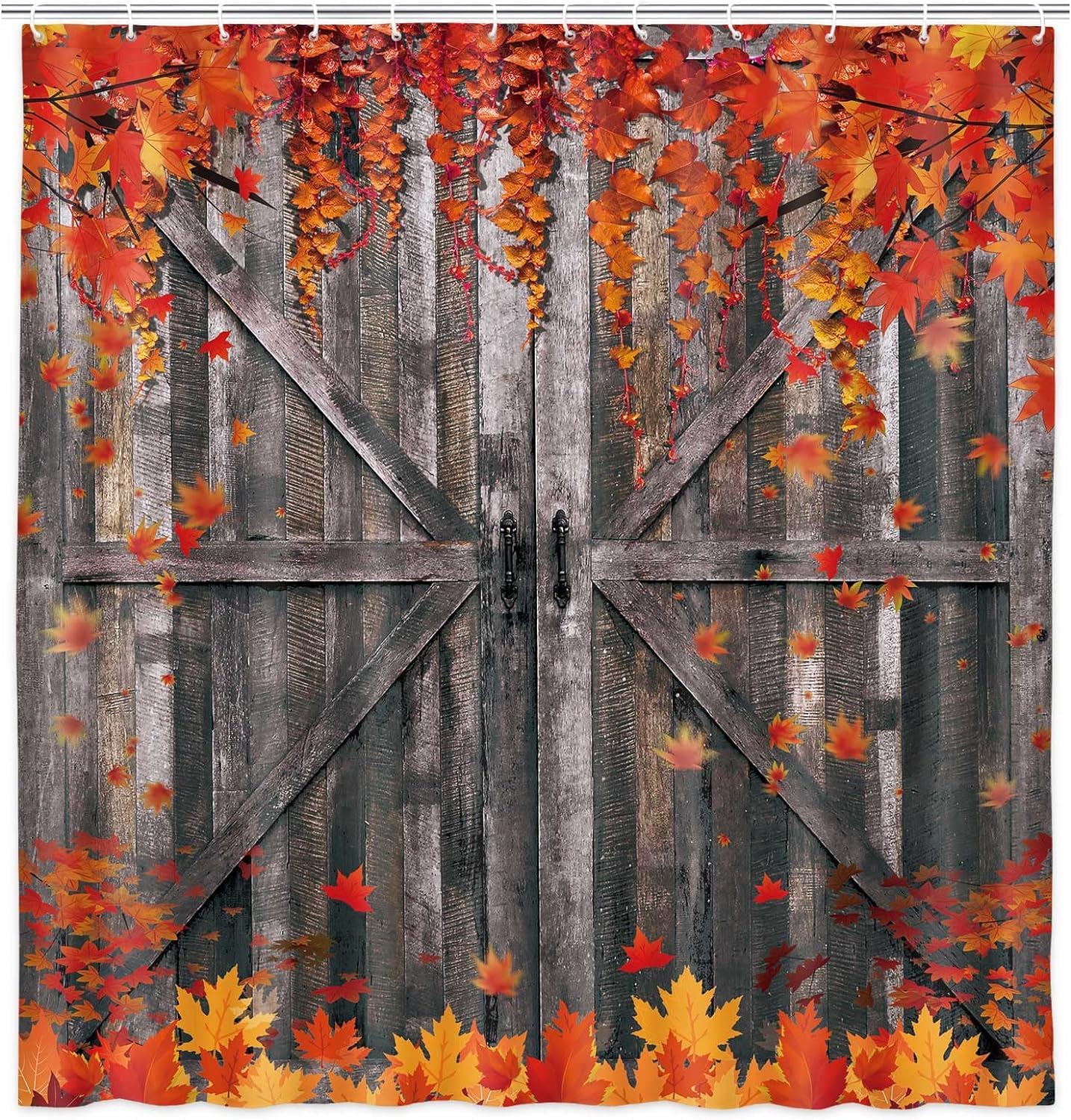 Rustic Fall Barn Door Shower Curtain Sets for Bathroom,Seasonal Theme Autumn Maple Leaves Bath Curtain, Retro Wood Board Thanksgiving Harvest Day Farmhouse Decoration Curtains with Hooks 72X84IN