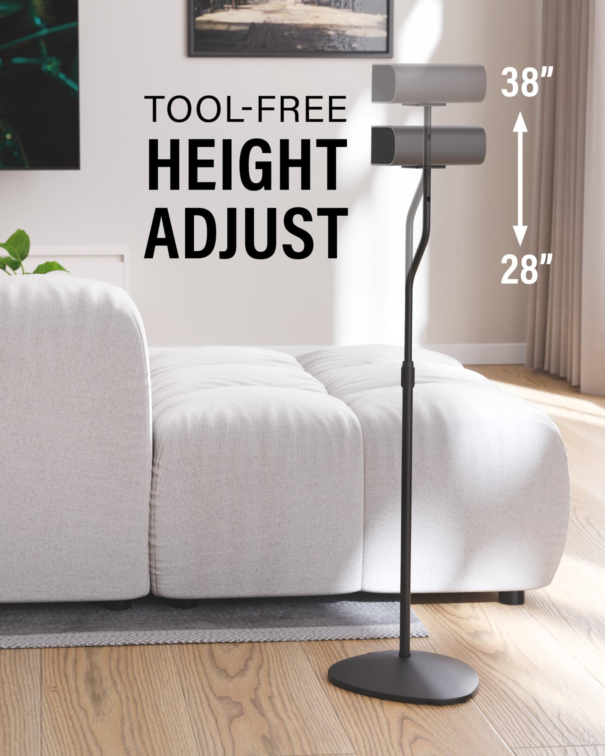 - Optimize your listening experience with 10' of height adjust. Easy to use collar makes height changes a breeze. Holds your speakers between 28' - 38'.