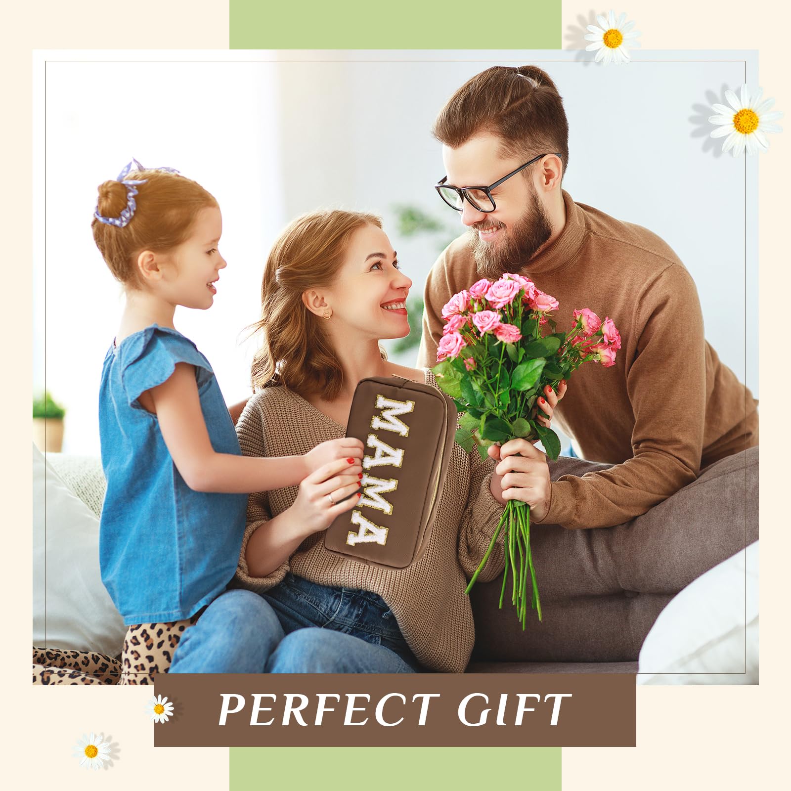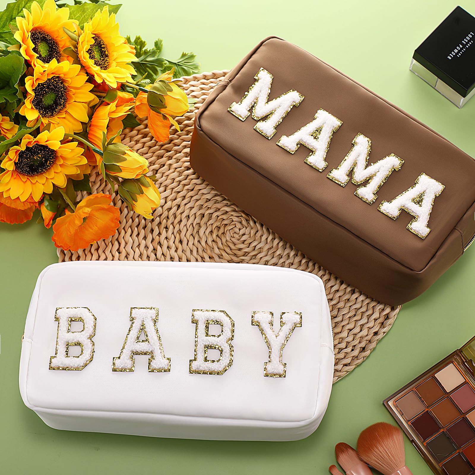 Sanwuta 2 Pieces Mama Gifts Makeup Bag Mom Birthday Gifts Nylon Cosmetic Bag Mothers Day Appreciation Toiletry Preppy Patch Chenille Letter Pouch for Women Her New Mom(Camel, White,Baby and Mama)