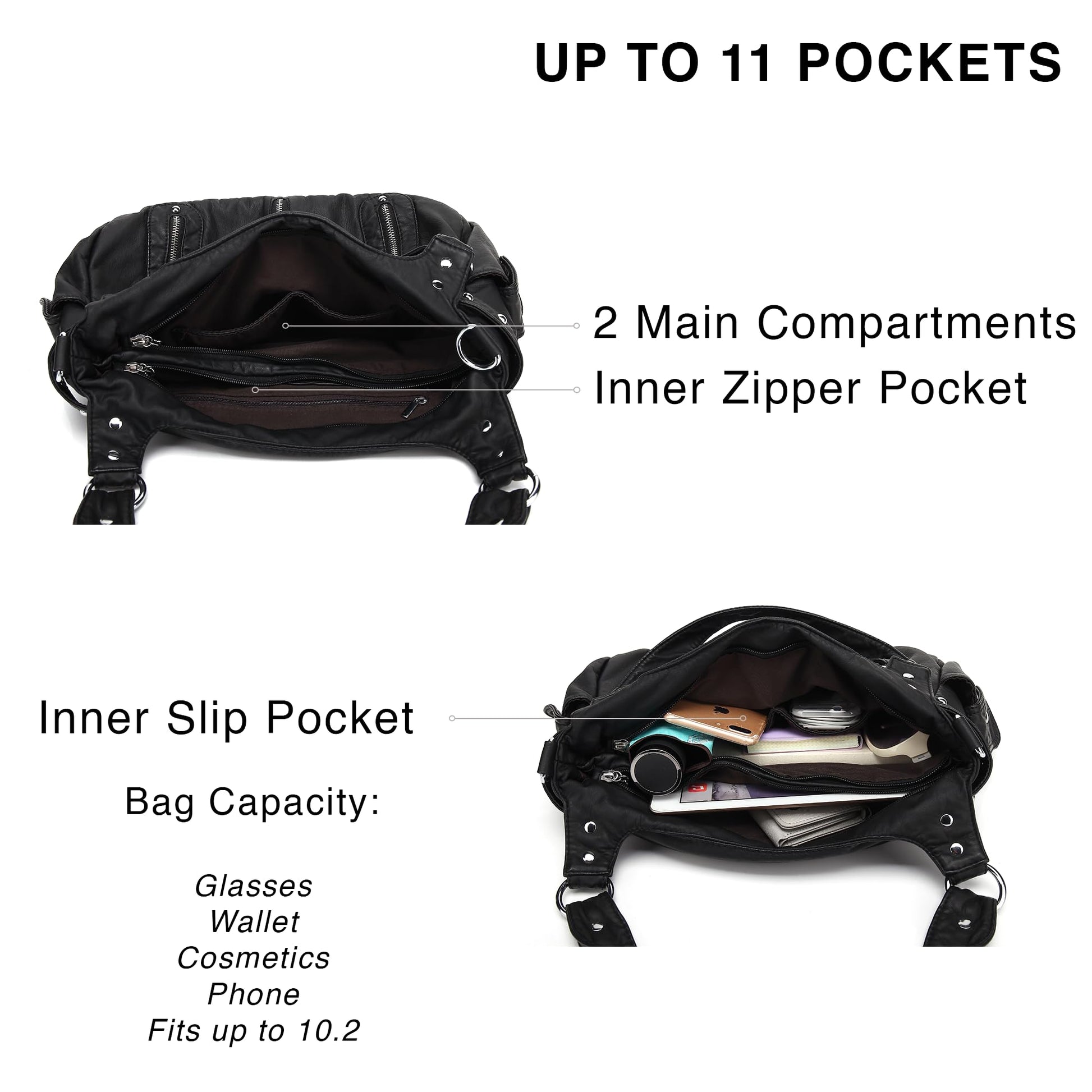 - [Dimensions] - Bag: 14' x 5.5' x 9.5'; Weight: 1.45lb; Detachable and adjustable shoulder strap drop: 27'; Can fit an iPad (10.2'), phone, cute wallet, makeup set, small book, mask, accessories etc. It goes with any outfit. Super fine womens purse and fantastic gift choice for womens and ladies