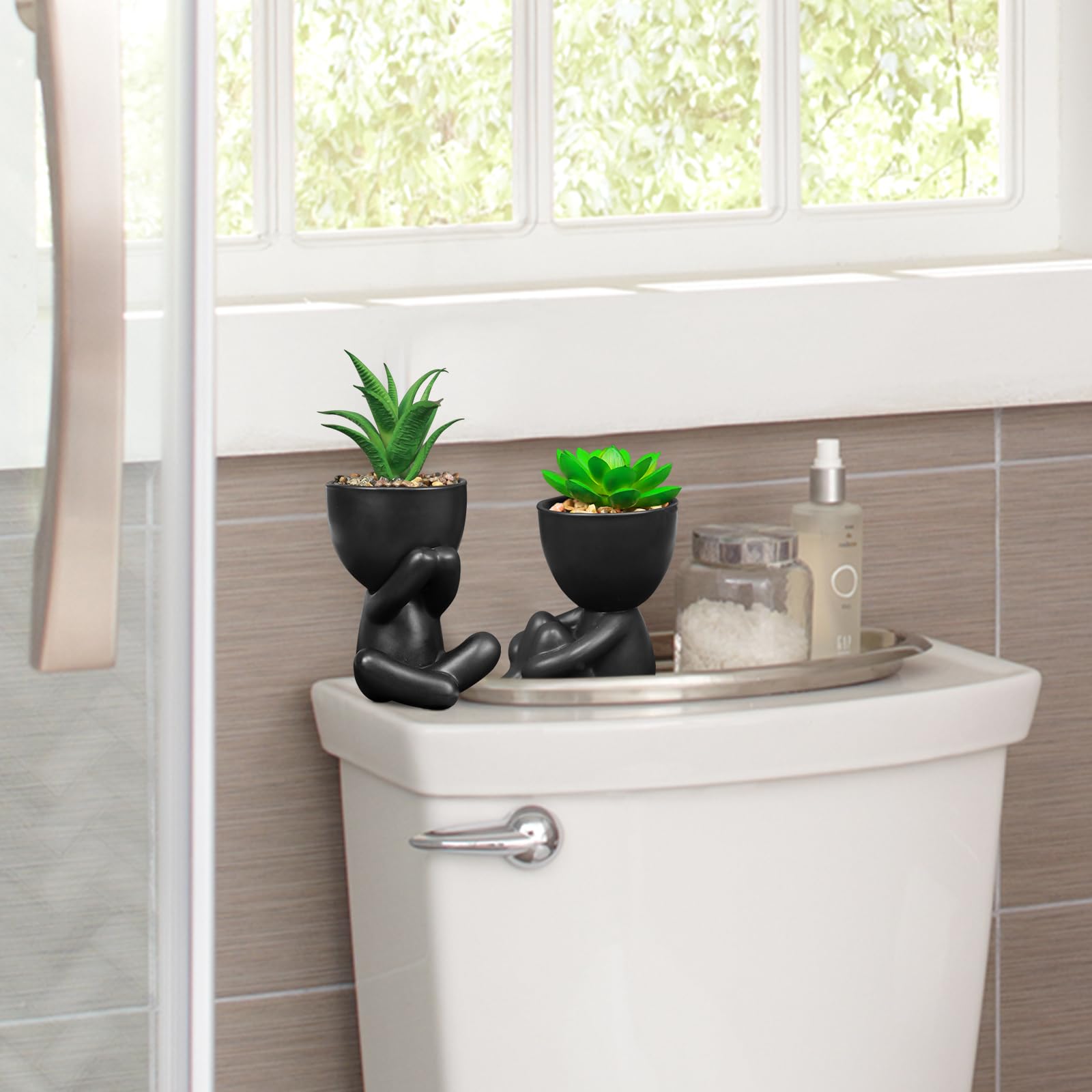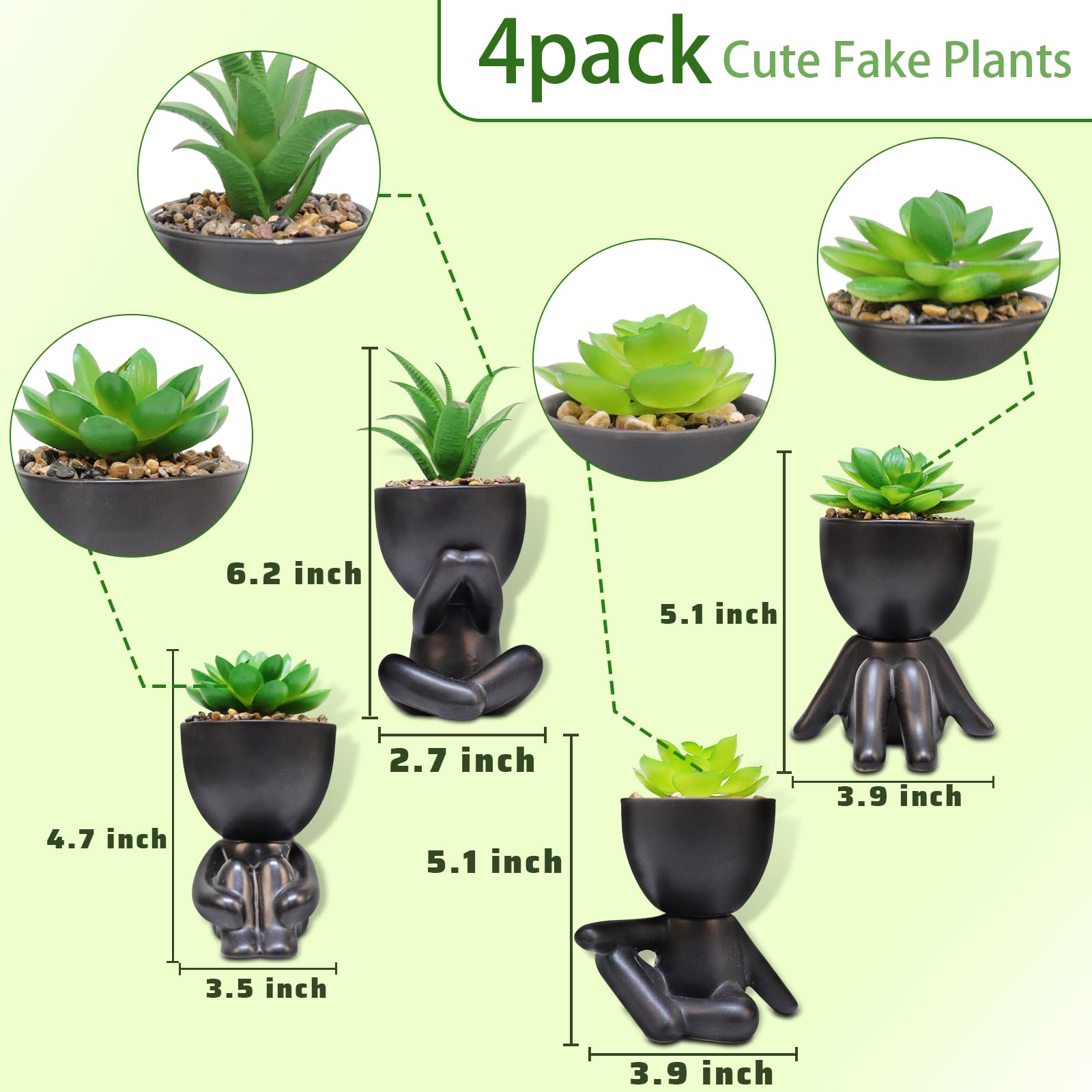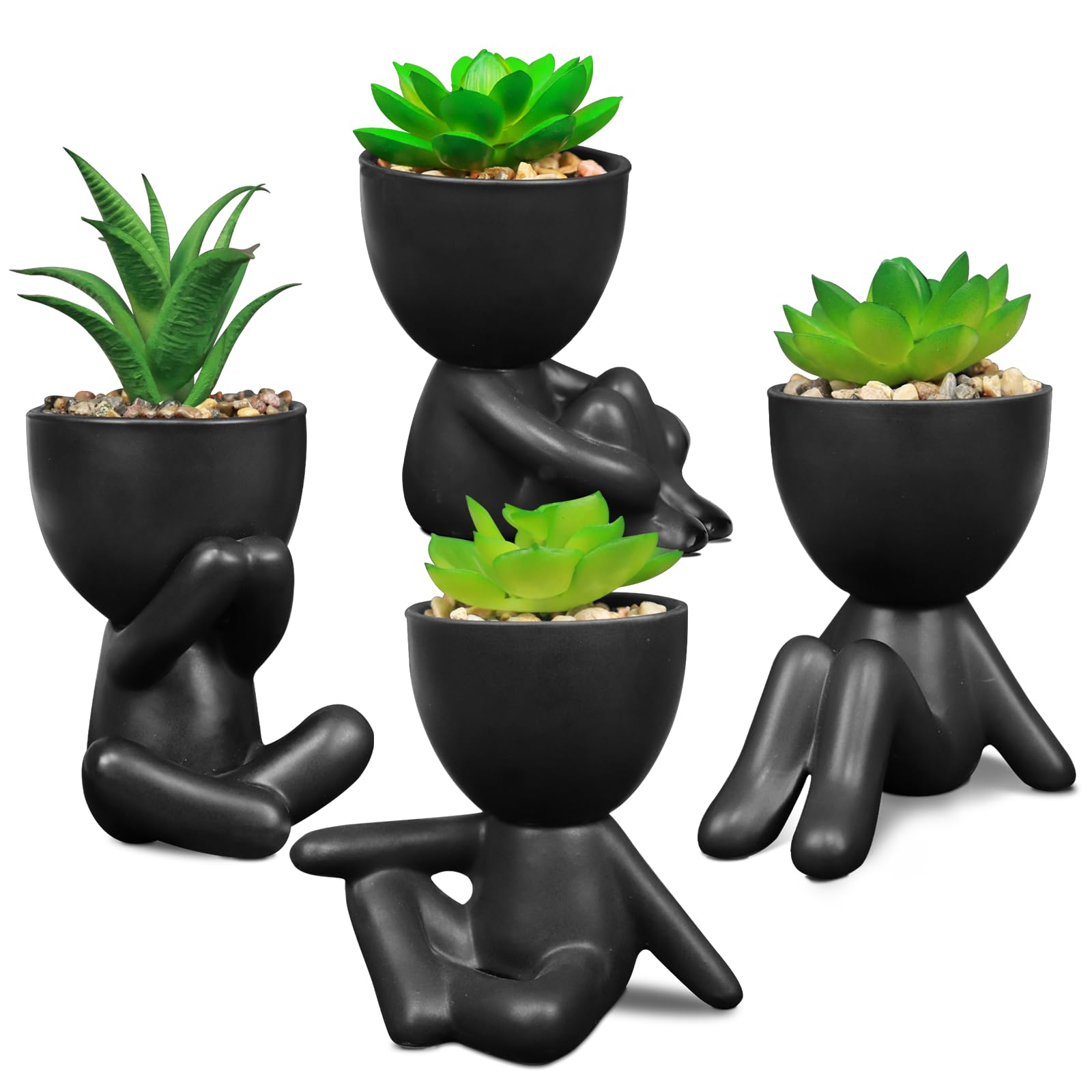 SEMSOIIO Pack of 4 Black Cute Fake Plants, Artificial Succulent Plants with Creative Human Shaped Pots,Mini Potted Desk Plants for Office Bathroom Shelf Cubicle Home Decor (Matte Black)