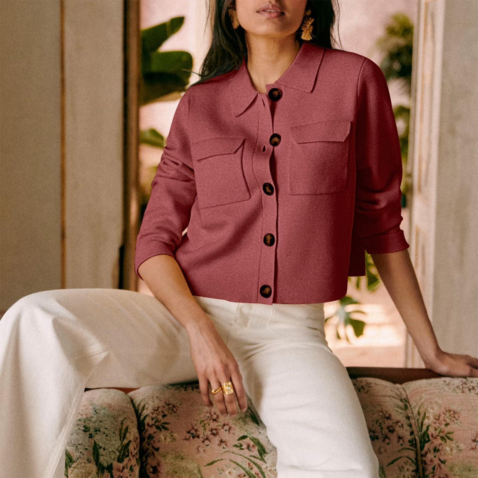 Senllen Women Cropped Cardigan Sweaters 2025 Casual Trendy Collared Button Down Open Front Long Sleeve Knit Shackets Jackets