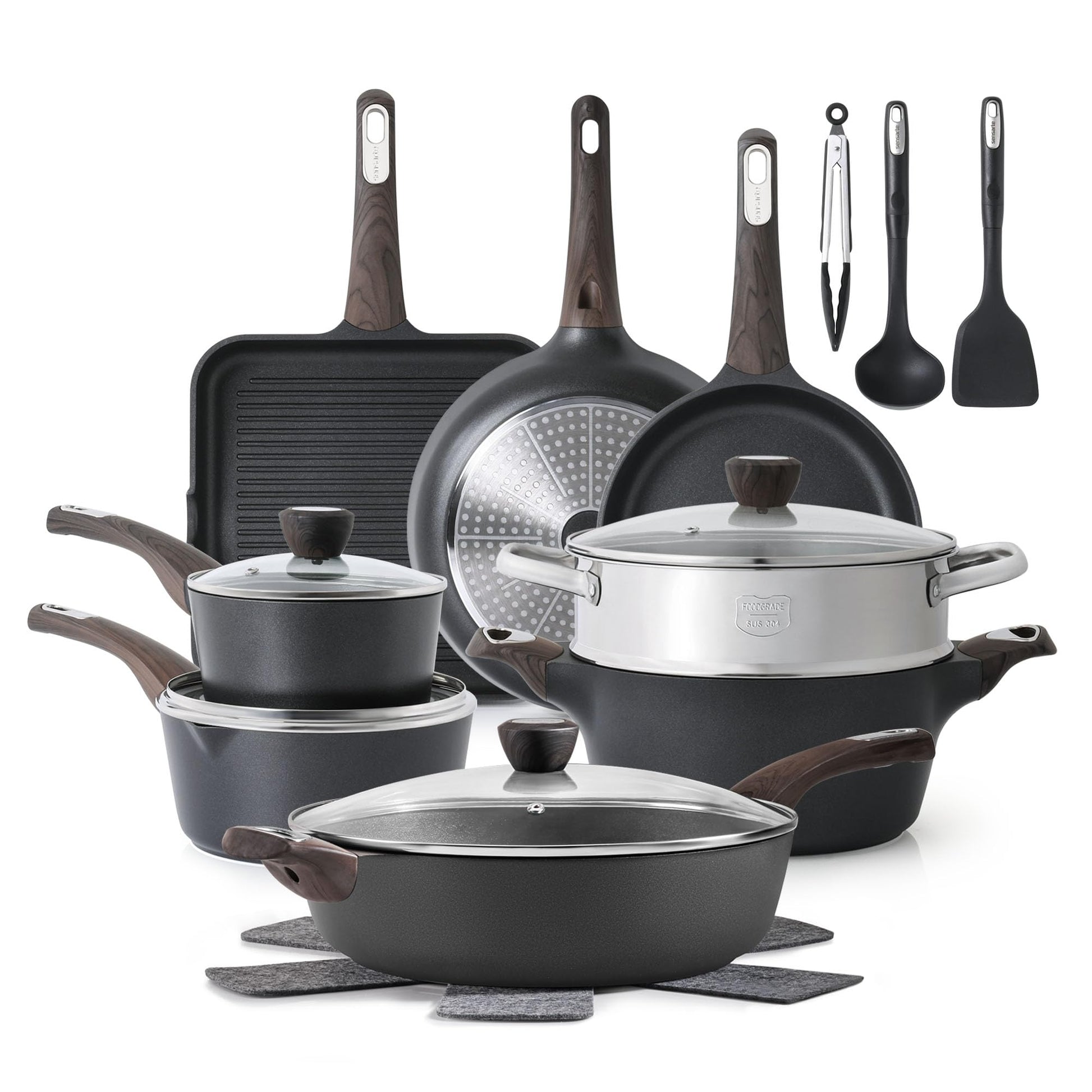 - 20-Piece Pots and Pans Set Includes - 9.5 & 11 inch frying pan set, 5Qt saute pan with lid, 4.5Qt casserole with lid & steamer, 1.5Qt & 2.5Qt saucepan with lid, 11 inch grill pan, Silicone spatula & spoon & tong, 5pcs pot protectors.
