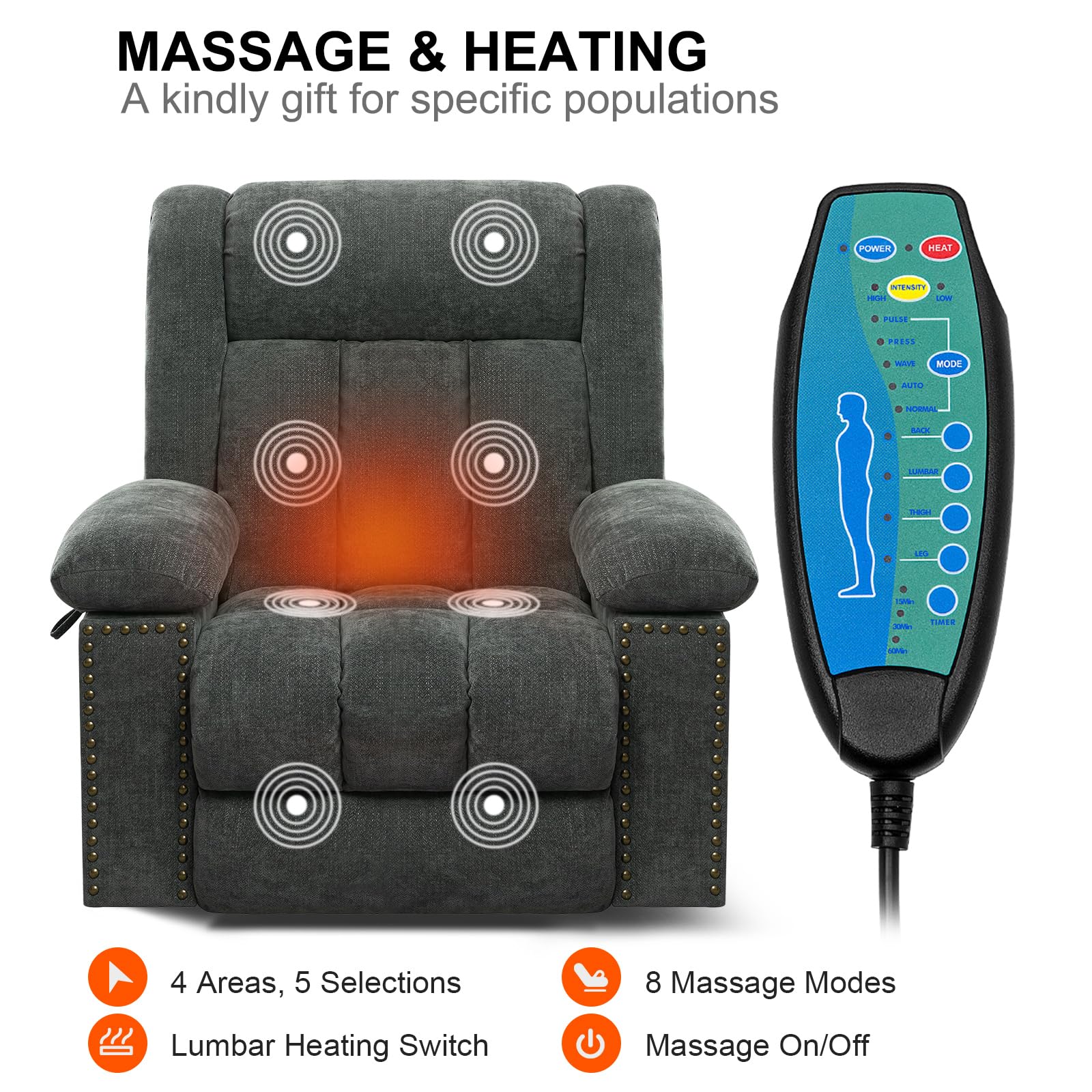 - 【Heating & Massage Function】This power recliner chair come with 8 powerful vibration motors, 4 custom zone settings and 5 modes. In addition, there are timing of remote control and waist heating functions. Through vibration and heat to achieve massage effect, making you feel relaxed