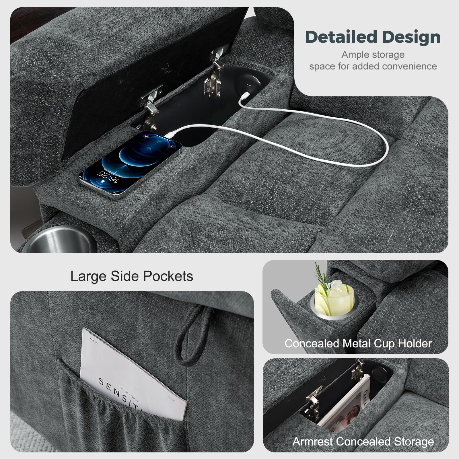 - 【Humanized Design】The armrests storage space and side pockets can be put some small items within reach, more convenient. 2 concealed cup holders offer you wonderful home theatering experience.Concealed USB & Type-C charging allows you to charge low-power devices from the comfort of your chair. The sturdy steel frame and high-density 26D foam cushion ensure both long-lasting comfort and support for a maximum weight of up to 350 pounds. Overall Size: 39.6'D x 38.5'W x 41.5'H