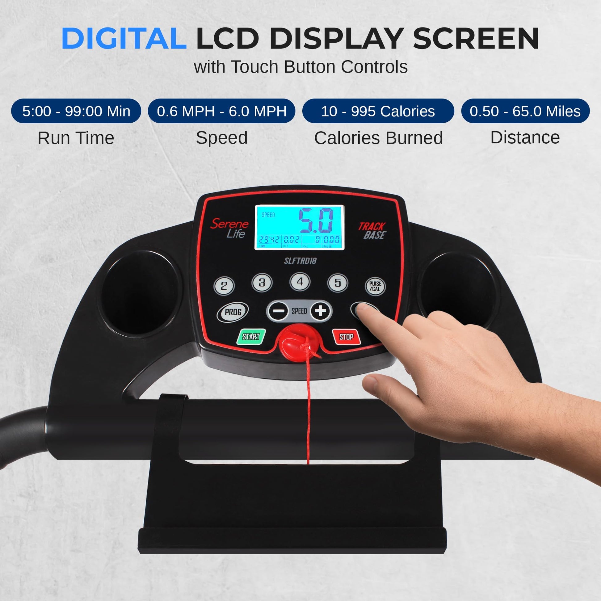 Details: SereneLife Model : SLFTRD18Digital Smart TreadmillTrack Base Smart Digital Treadmill with Downloadable App Features: Smart Digital Treadmill DesignGet Connected with the ‘FitShow’ AppPairs to Your Device via Bluetooth ConnectivityRunning & Training Data Statistics ReadoutCompact Form-Fitting Design for Any Room in the HouseBuilt-in Hand Grip Sensors for Pulse MonitoringDigital LCD Display Screen with Touch Button ControlsDisplays Run Time, Distance, Speed, Calories Burned, Heart RateAdjustable Speed SettingsSelectable Preset Training ModesSimple Electric Motorized Plug-in DesignConvenient Folding Style for Easy Setup & StorageUsed for Walking, Jogging, Running Exercise TrainingPerfect for Weight Loss, Cardiovascular Fitness, Endurance & Stamina BuildingIntegrated Safety Key, Emergency Power OffRemovable Book / Tablet Device Holder*Some Assembly RequiredThe ‘Fitshow’ App: Train Smarter and Connect via Your Favorite DeviceWorks with Smartphones, Tablets, Laptops, etc. Free to Download via Your SmartphoneMultifunctional Sports AppConnect to the Treadmill via BluetoothApp Provides Access to Exercise ActivitiesLinked to ‘HealthKit’ to Record and Collect Activity DataEasily Share Health and Fitness Data via Social MediaAvailable for iOS and AndroidBluetooth Connectivity: Hassle-Free Pairing, No Password RequiredCompatible with All of Today’s Latest Bluetooth Devices (Smartphones, Tablets, Laptops, Computers, etc. )Bluetooth Version: 4. 0 BLETechnical Specs: Motorized Treadmill Motor Power: 1. 0HPRunning Belt / Running Surface Size (L x w): 39. 3’’ x 13. 4’’ -inchesAdjustable Speed: 0. 6 – 6. 0 MPH (Up to 10 KMH)Maximum Weight Support: Up to 265 lbs. Power Supply: 120VThe SereneLife Track Base Smart Digital Treadmill with Downloadable App - Smart Digital Treadmill Design - Get Connected with the ‘FitShow’ App - Pairs to Your Device via Bluetooth Connectivity - Running & Training Data Statistics Readout - Compact Form-Fitting Design for Any Room in the House - Built-in Hand Grip Sensors for Pulse Monitoring - Digital LCD Display Screen with Touch Button Controls - Displays Run Time, Distance, Speed, Calories Burned, Heart Rate - Adjustable Speed Settings - Selectable Preset Training Modes - Simple Electric Motorized Plug-in Design - Convenient Folding Style for Easy Setup & Storage - Used for Walking, Jogging, Running Exercise Training - Perfect for Weight Loss, Cardiovascular Fitness, Endurance & Stamina Building - Integrated Safety Key, Emergency Power Off.