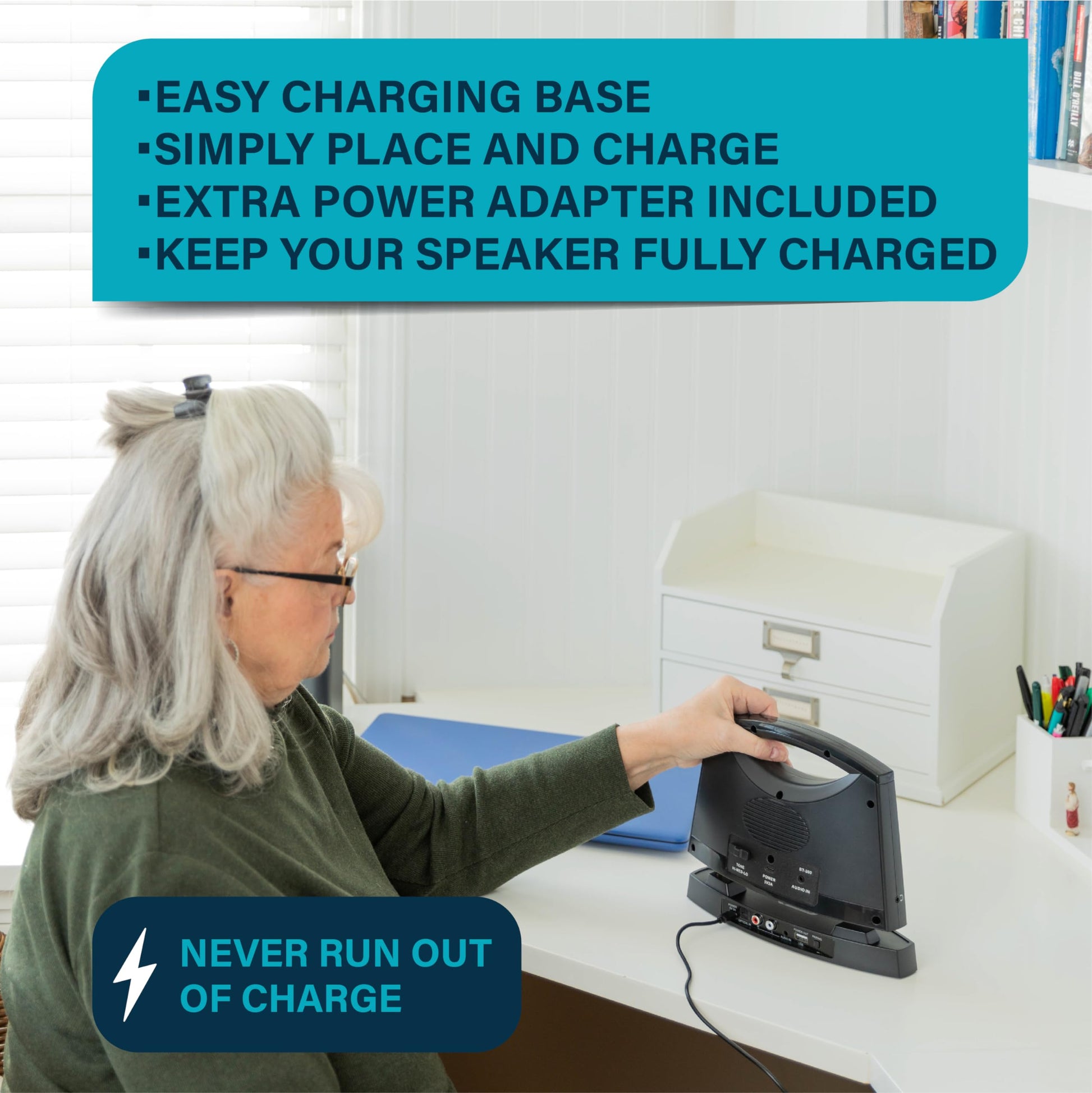 - Convenient Power: Charge in about 3 hours on a USB-powered base or connect directly to a standard charger with the included adapter.