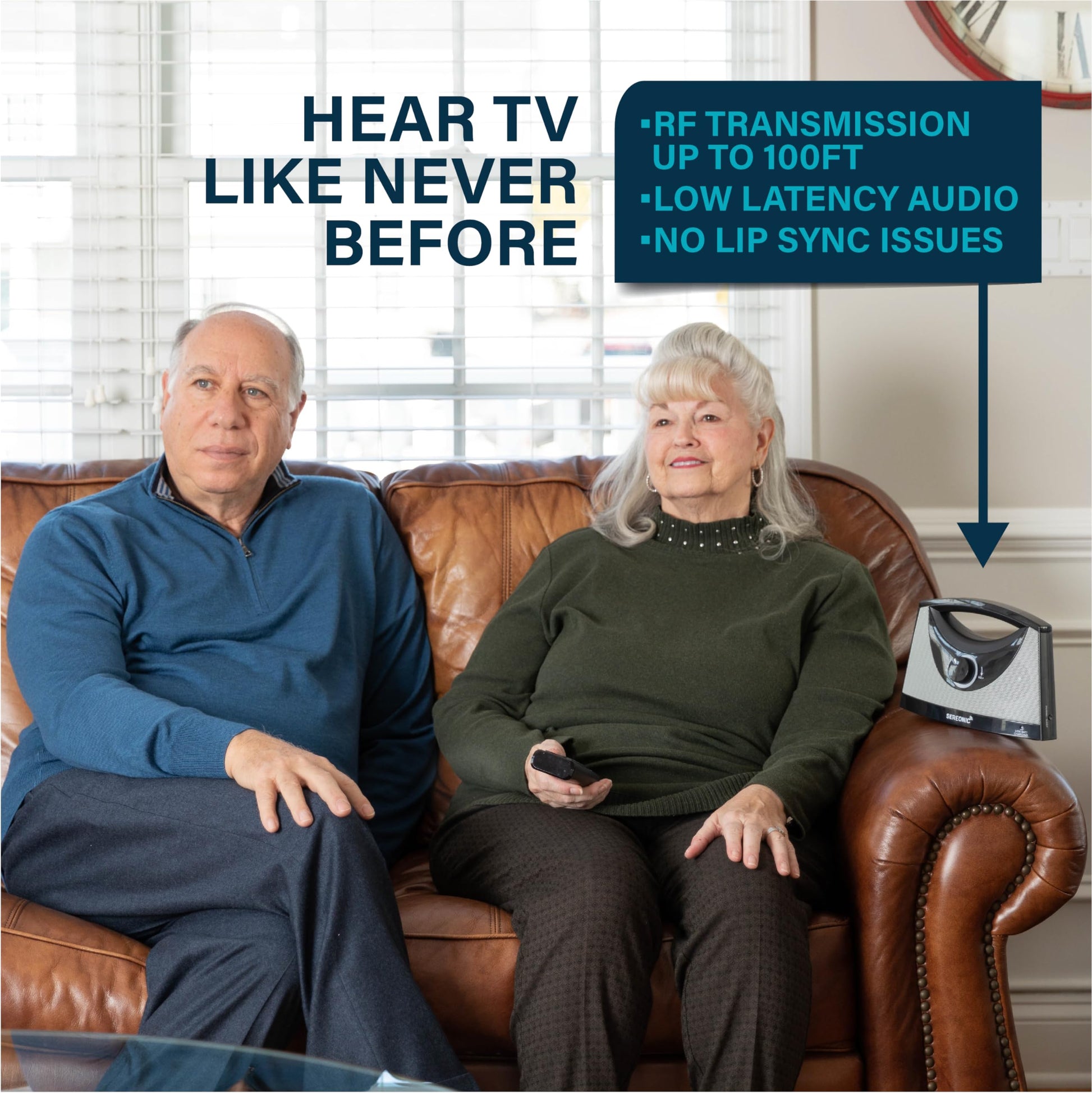 - Near Zero Latency: Transmits custom-tuned, zero-lag RF audio from the base to the TV speakers, unlike Bluetooth speakers.