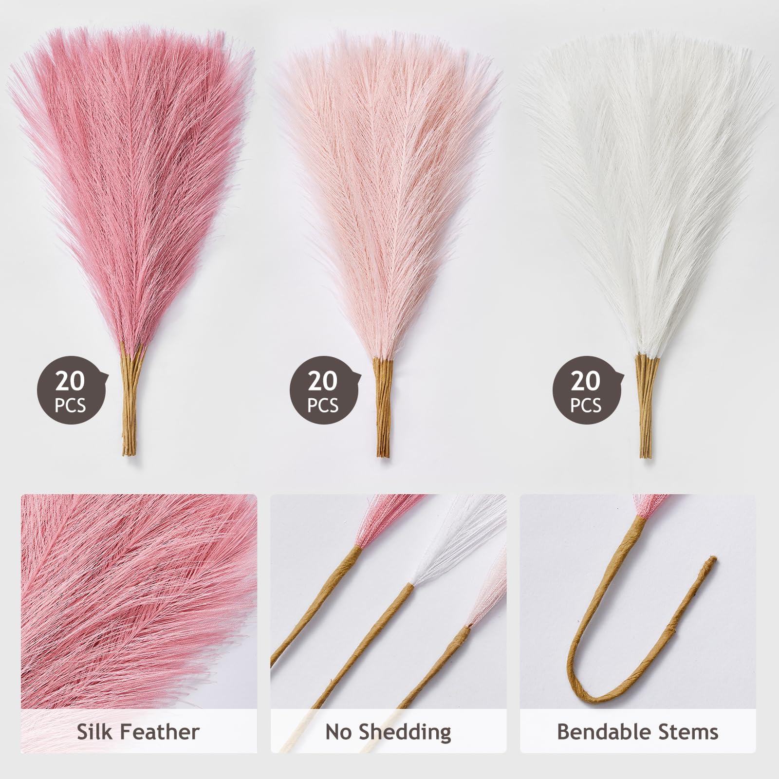 - Pink Pampas Grass: You will get a pack of 60pcs 17.7” artificial pampas grass, and the heads of each stem is designed you can fluff them up for a fuller look, create a chic minimalist or bohe room decorations aesthetic