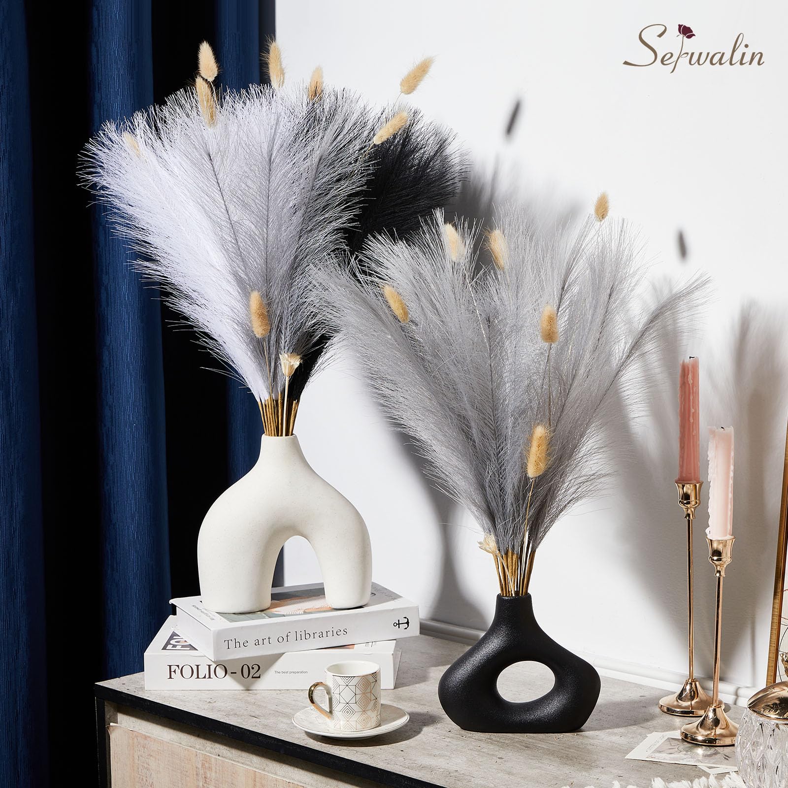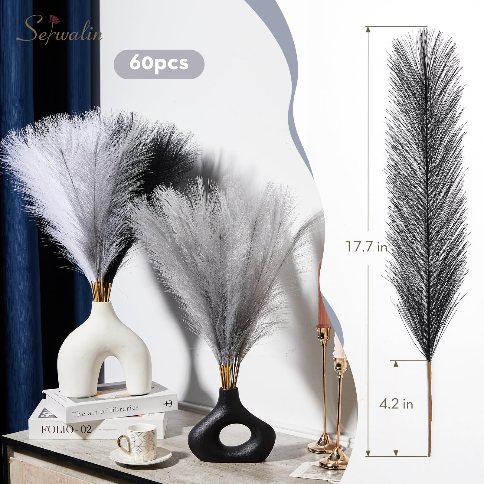 Serwalin 60Pcs Black Pampas Grass Decor, 17'' Faux Pampas Grass, Fluffy Artificial Pompous Grass Vase Filler Flower Arrangement for Living Room Decor Wedding Party Home Decor (Black&White&Gray)