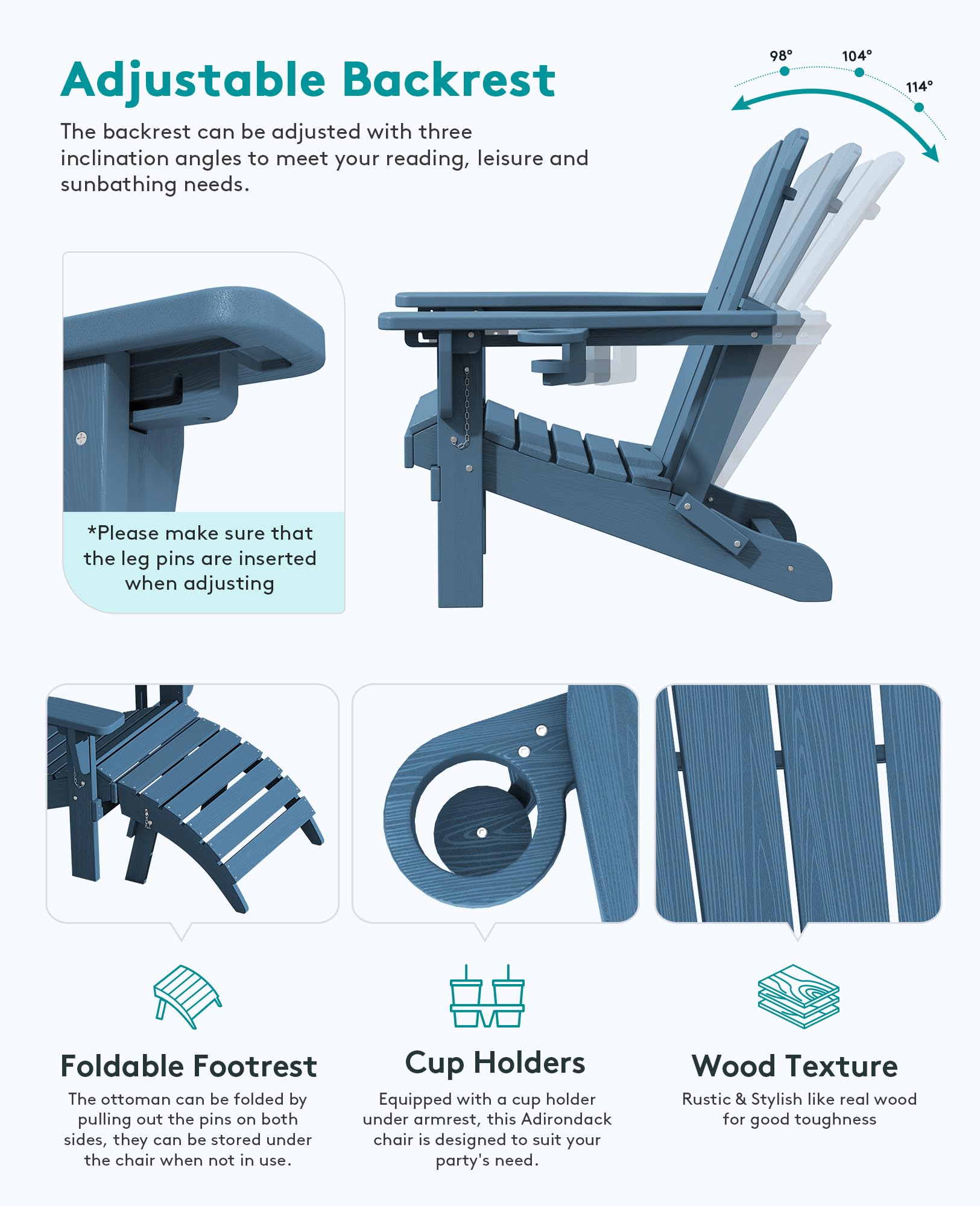 SERWALL 5-Piece Adirondack Chair and Ottoman and Table Set, HDPE Weather Resistant Adjustable Backrest Adirondack Chair with Ottoman and Side Table, Navy