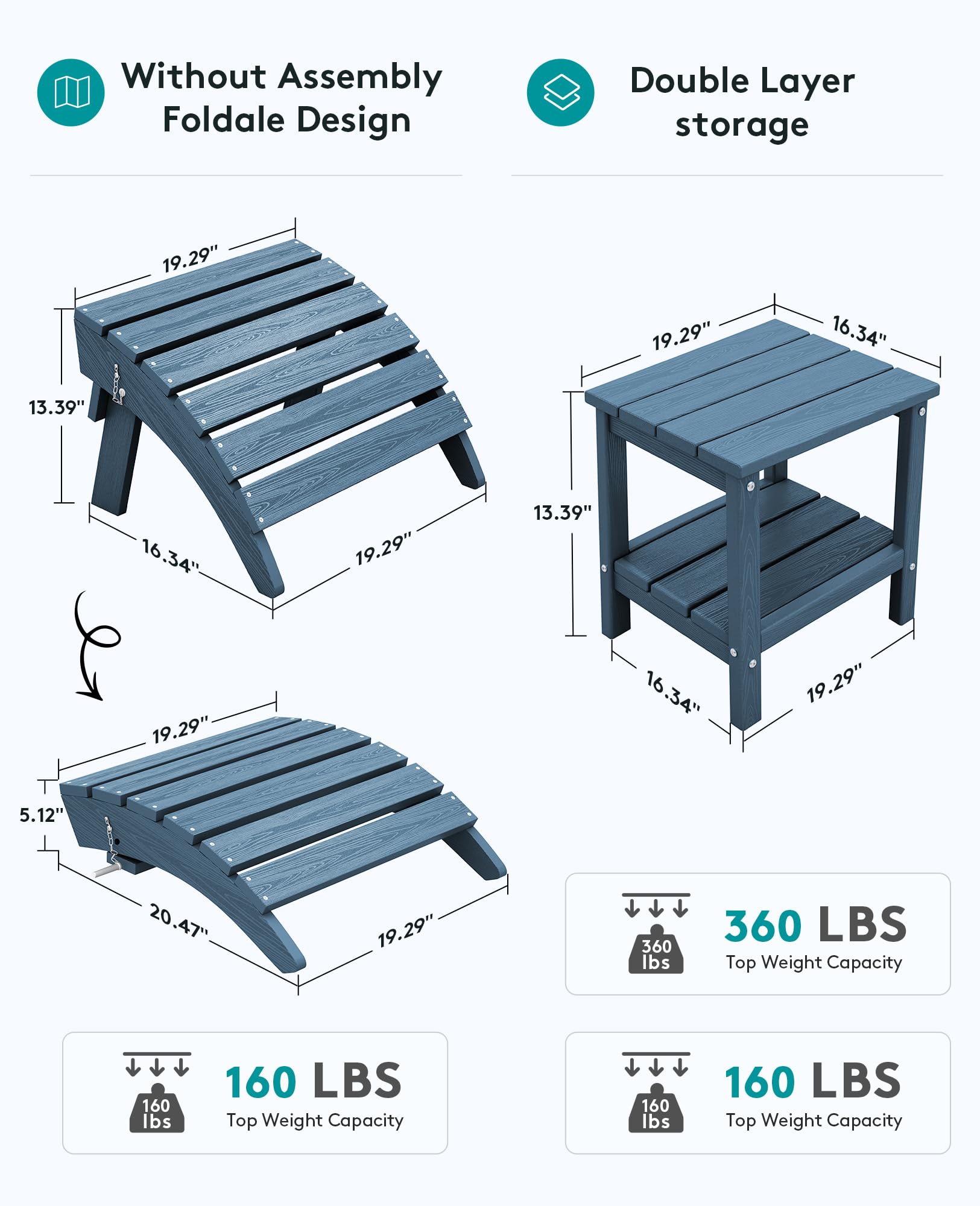 - Complete Adirondack Set: Package includes: 2 Adjustable Adirondack Chairs, 2 Folding Adirondack Ottoman, A Double Layer Outdoor Side Table. Everything you need for a cozy outdoor seating arrangement is included, making it convenient for setting up your relaxation zone.