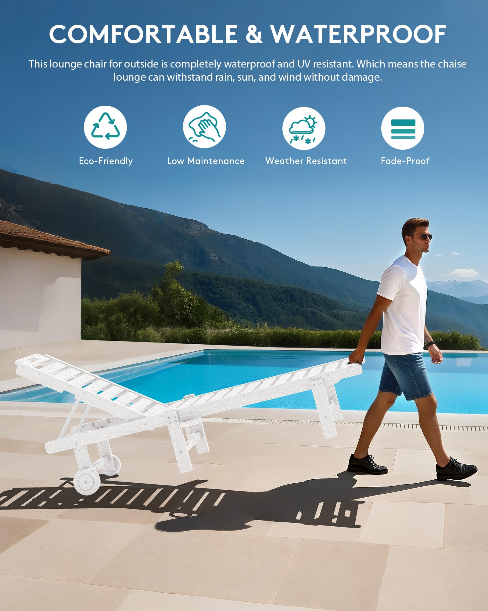 - Rolling Wheels & Handles: This patio chaise lounge comes with convenient rolling wheels and handles, pull on the handle to move it easily to follow the sun or find shade. Enjoy the sun and warm weather on this adjustable chaise lounge, our hdpe lounge chair is perfect for poolside, patio, garden, beach, or deck
