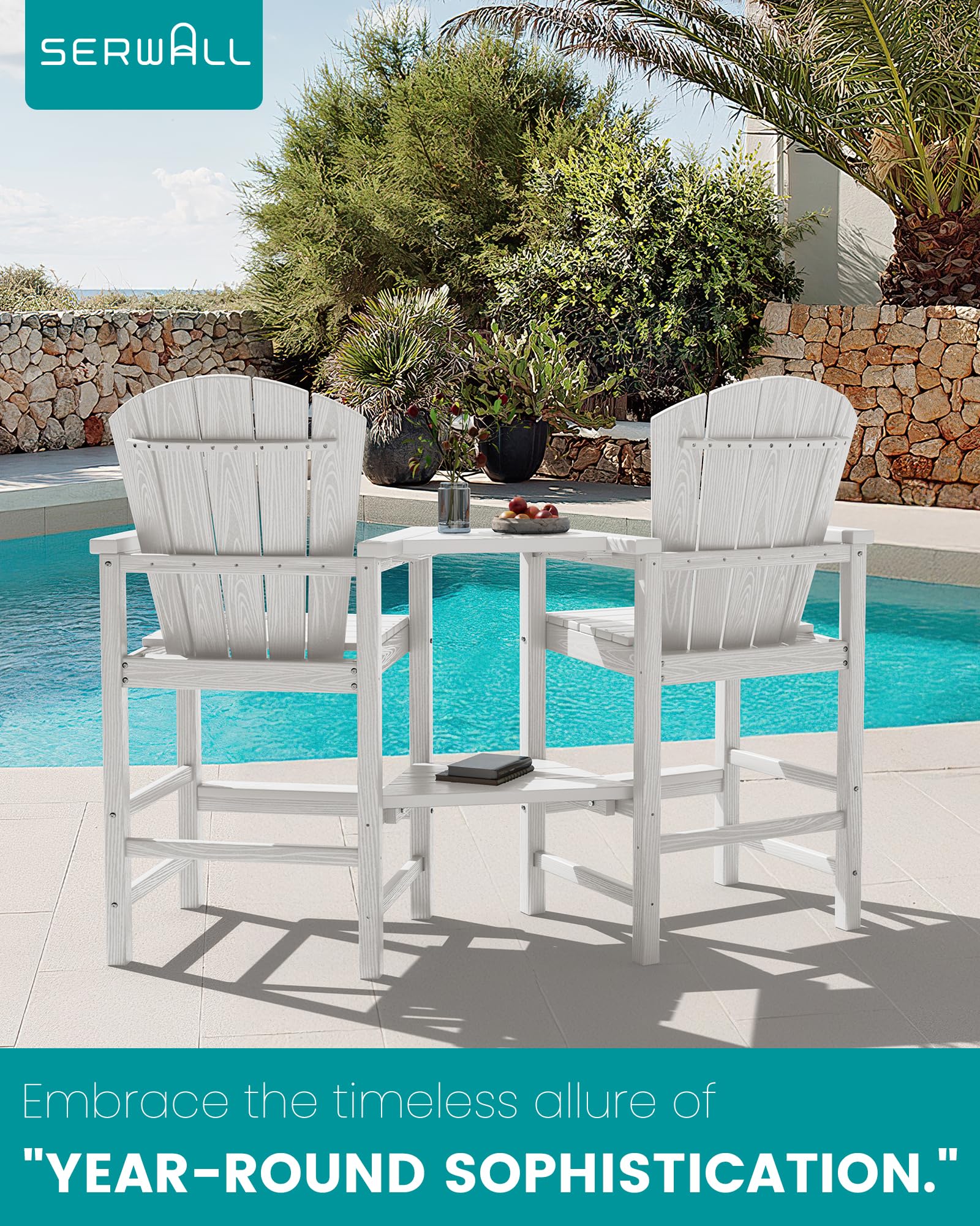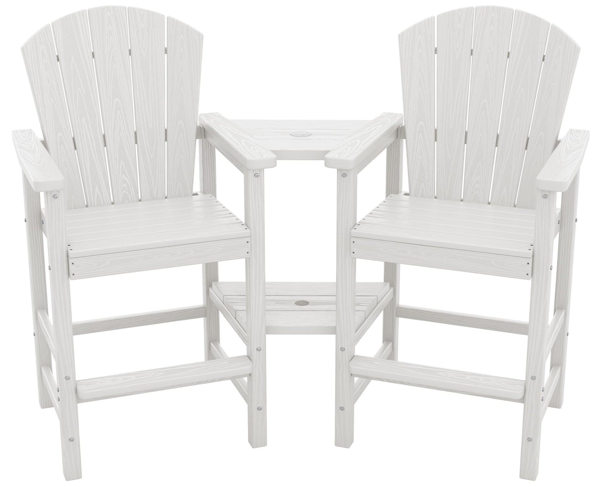 SERWALL Tall Adirondack Chairs Set of 2 with Double Layer Connecting Tray, HDPE Bar Height Outdoor Chairs, Wood-Like Adirondack Bar Stools for Patio, Balcony, Porch, White