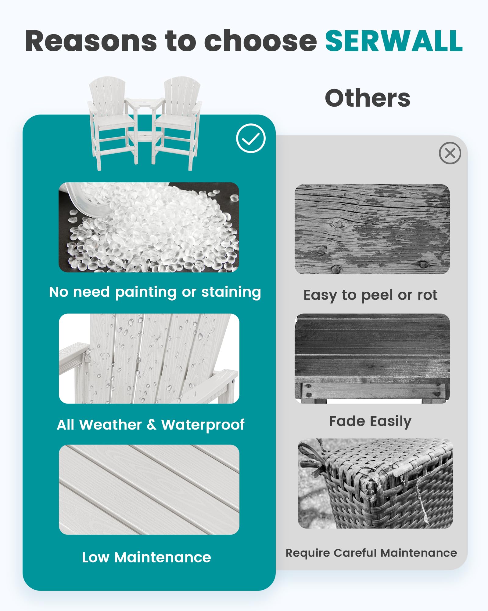 - HDPE Material: Enjoy the unique feel of the wood grain texture created by High-density polyethylene material, which offers not only a comfortable surface but also exceptional weather resistance and durability for maximum outdoor enjoyment