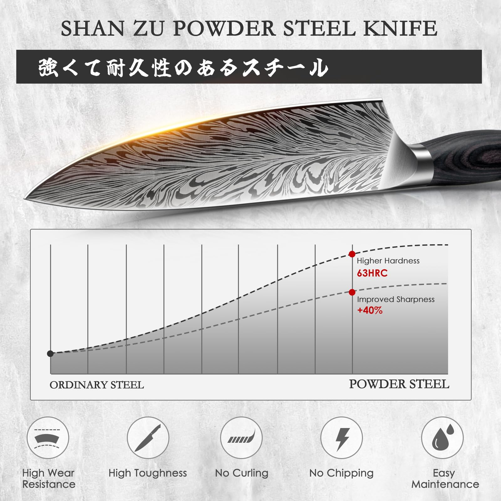 - High-Quality Japanese Powder Steel: The SHAN ZU Knife Set is made from high-carbon Japanese powder steel with a hardness rating of 63HRC, making it tougher than 99% of standard steel. Processed using advanced metallurgical techniques, these knives guarantee exceptional durability and longevity, ensuring they remain reliable kitchen companions for years to come