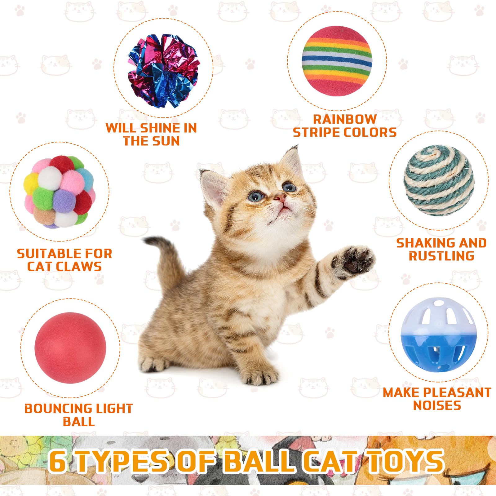 - Kitten Cat Ball Toys Assortments: you will receive 150 pieces of kitten toys for indoor kittens, a total of 10 toy categories, including 32 small colorful springs, 30 feather tail mice, 20 mute plush balls, 20 table tennis balls, 18 crinkle balls, 10 striped rainbow balls, 10 plastic bell balls, 4 lattice balls, 4 sisal balls, 2 caged rat balls, enough to meet your daily use and replacement needs