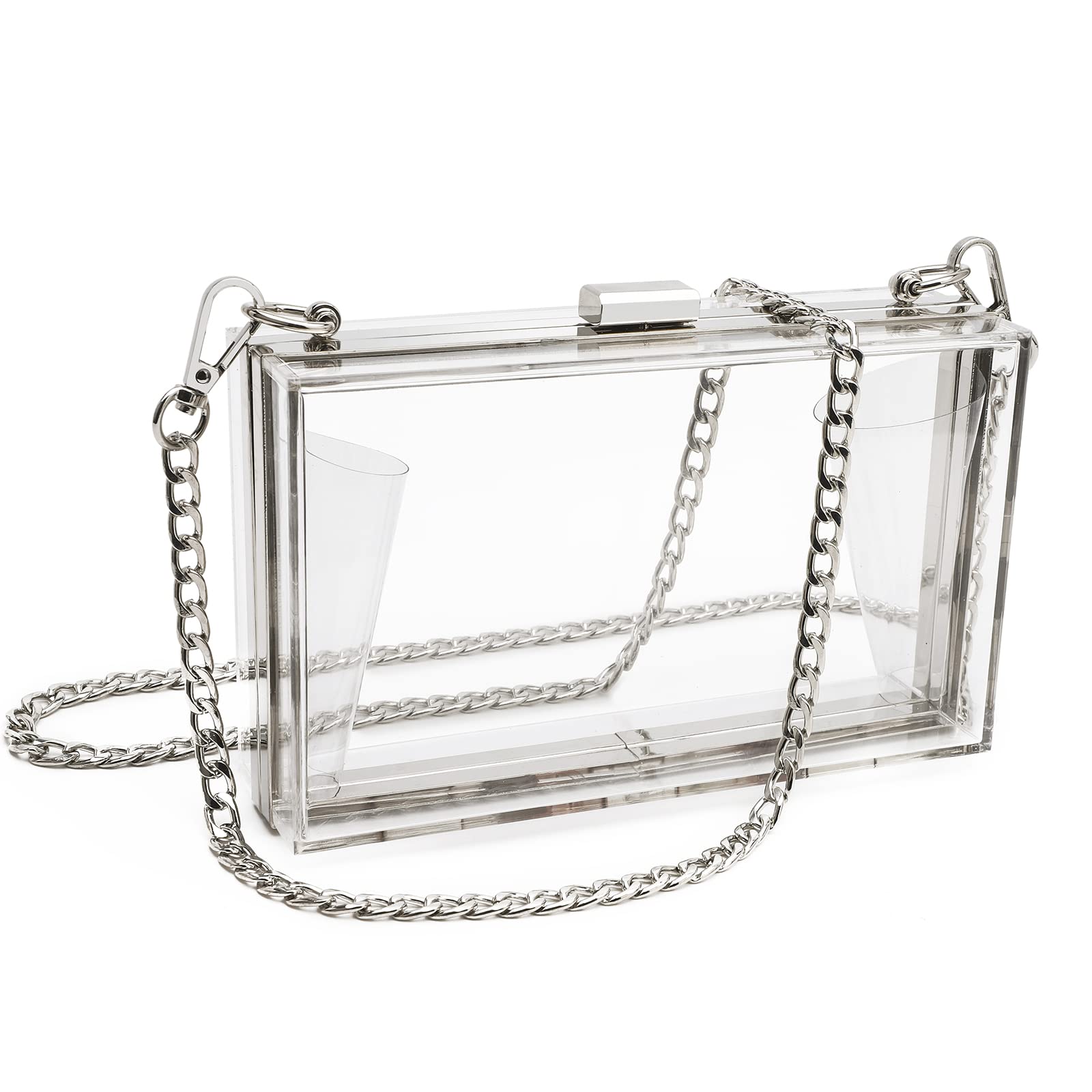 - 【EASY CARRY】: This clear clutch purse is very easy to carry as clucth handbag, evening bag, shoulder bag or crossbody bag, and come with removable silver chain strap with length 46'.