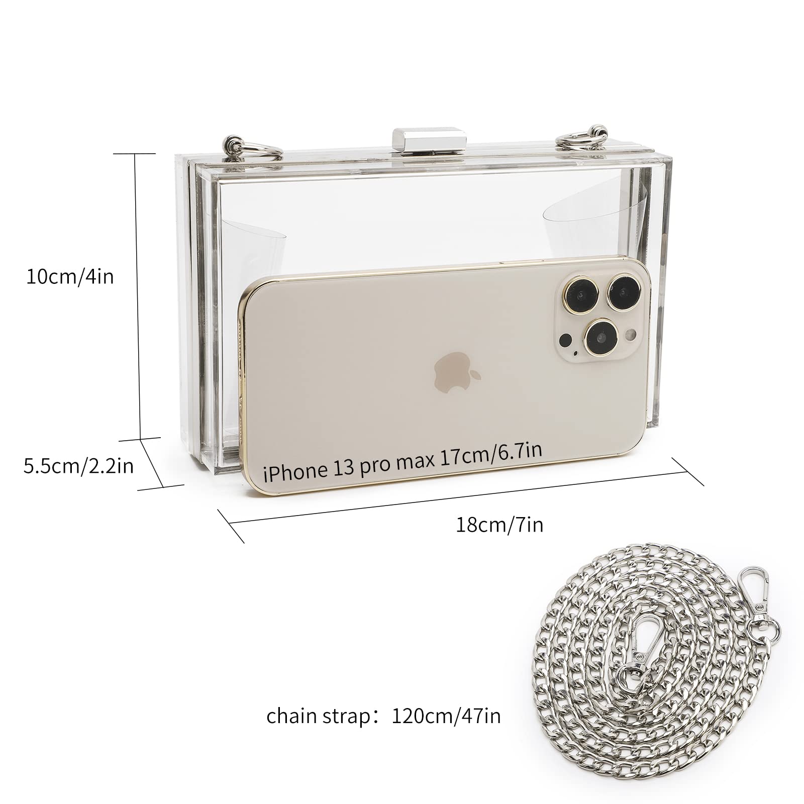 SharPlus Women Cute Clear Purse Acrylic Box Clutch Handbag, Transparent Crossbody Evening Bag Stadium Approved Silver Chain Strap