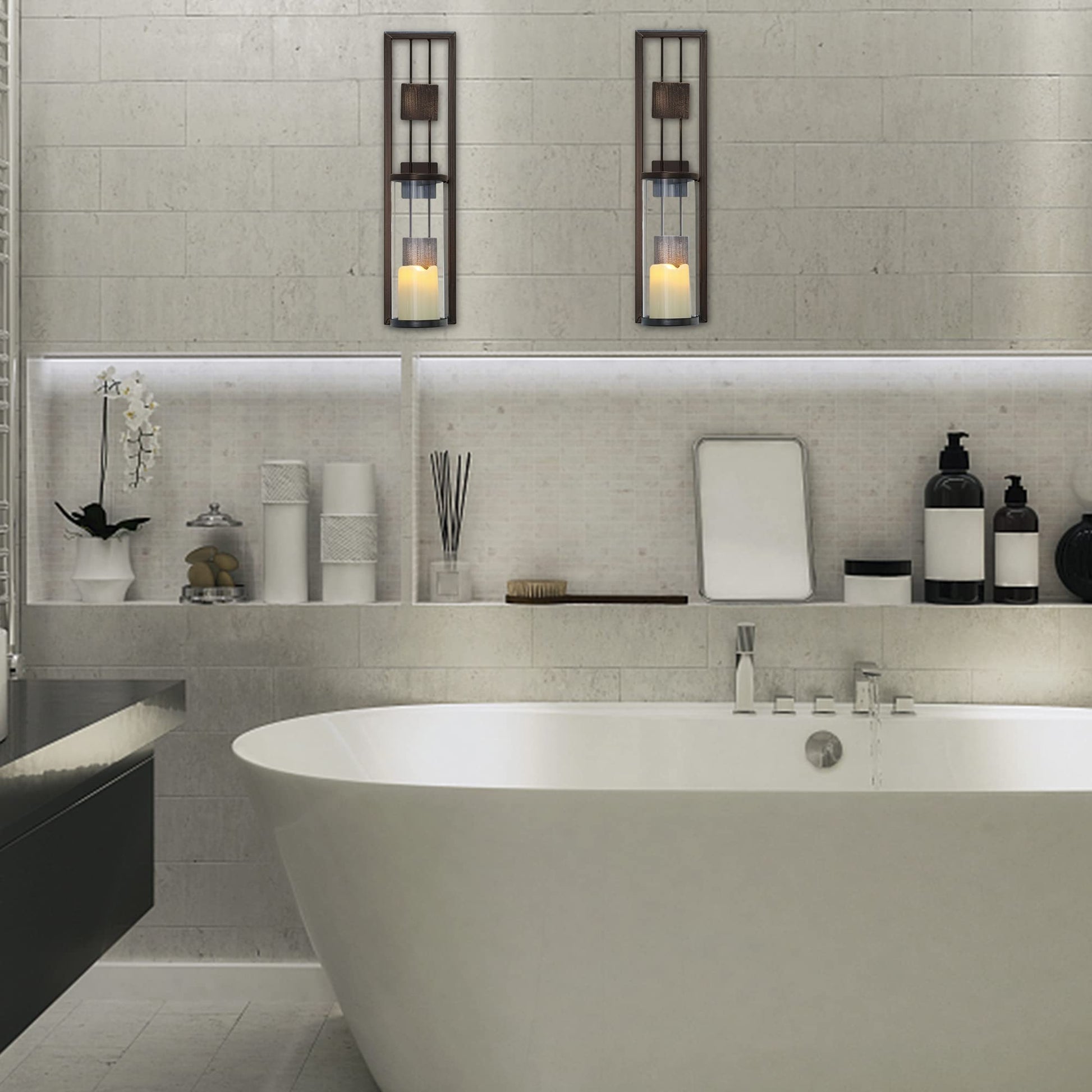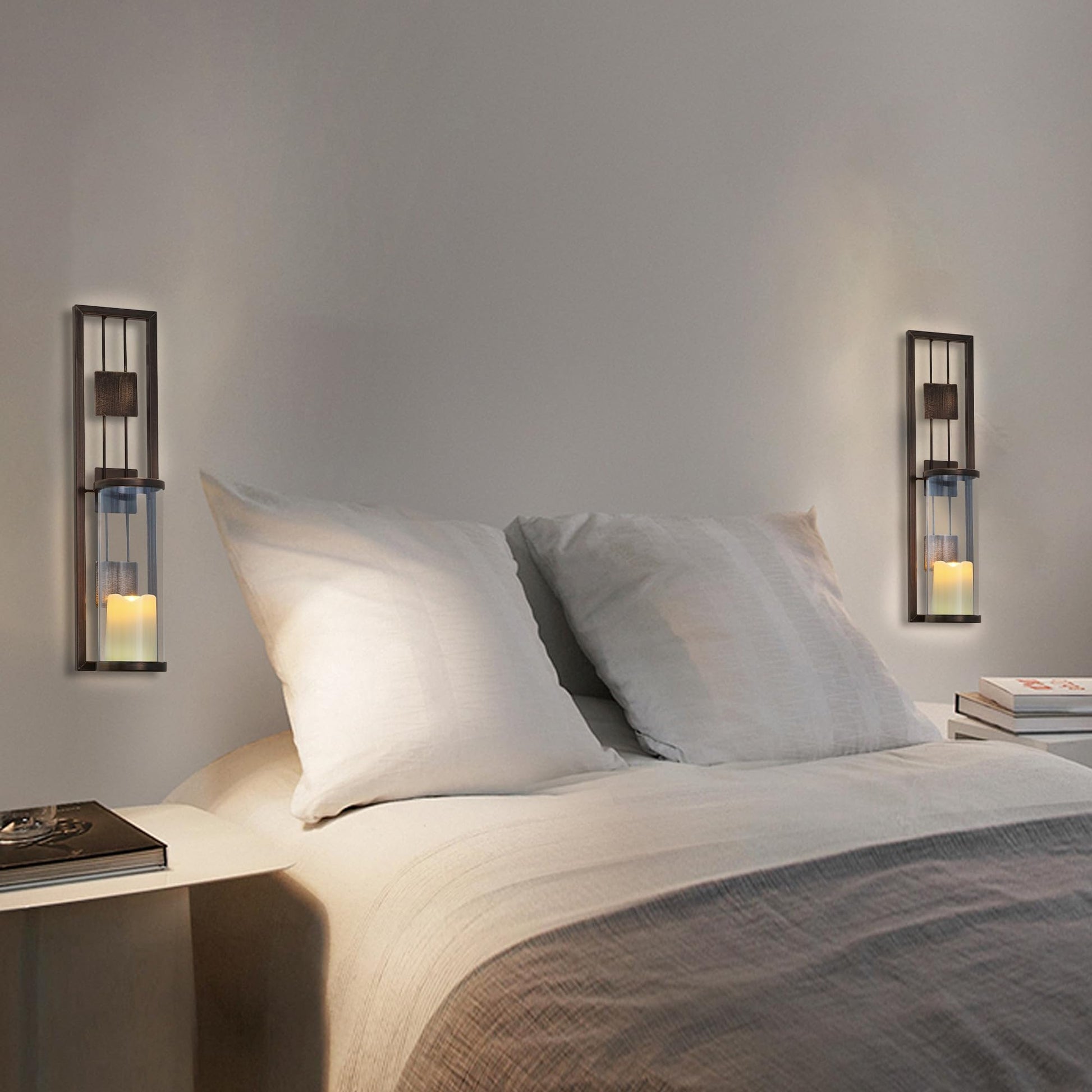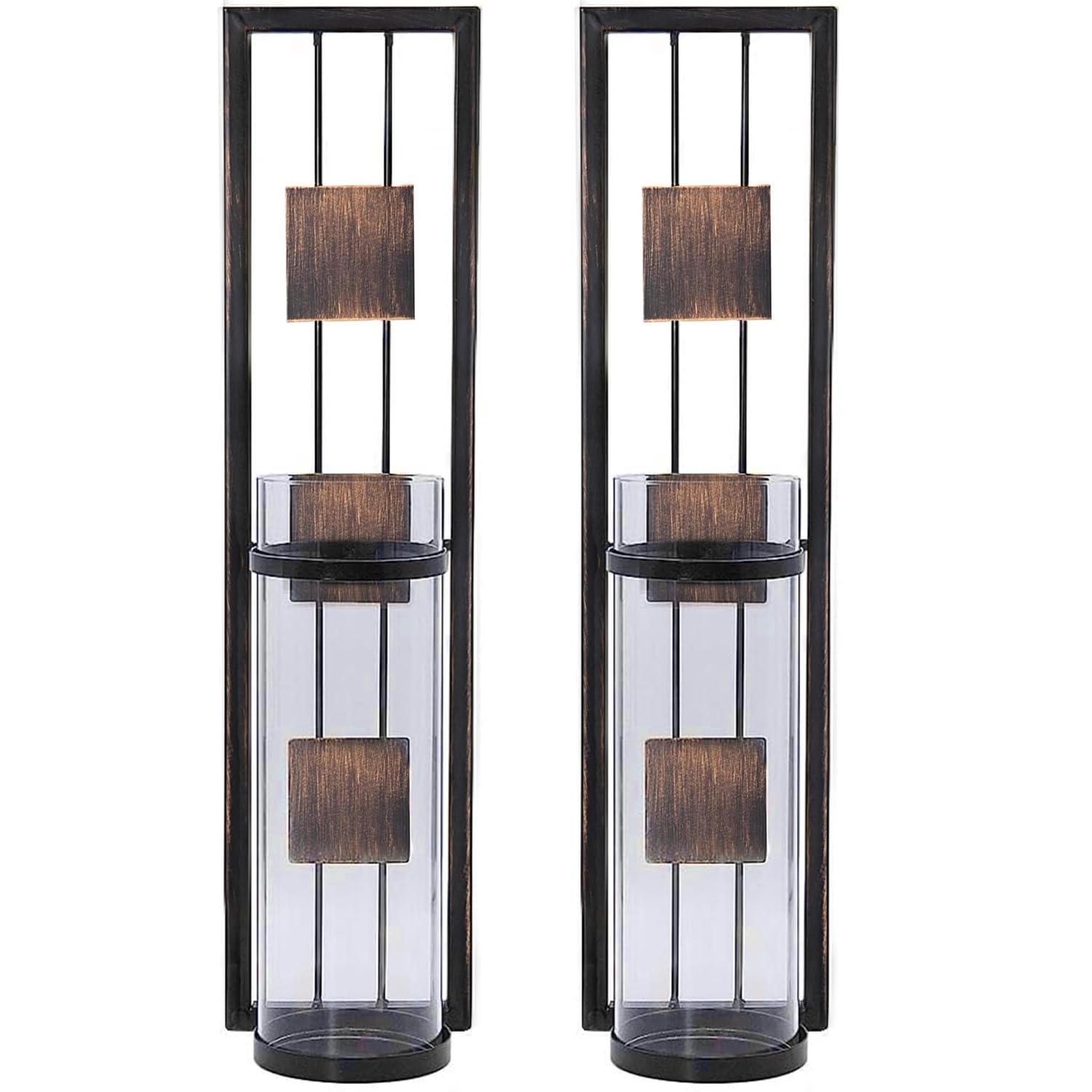 - RETRO CANDLE SCONCE- Add an eye-catching look to any space with this fabulous pair of wall sconce candle holders. Each sconce features an openwork rectangular silhouette, cylindrical plastic shade, and flameless LED light candle(not include battery) to increase brightness.