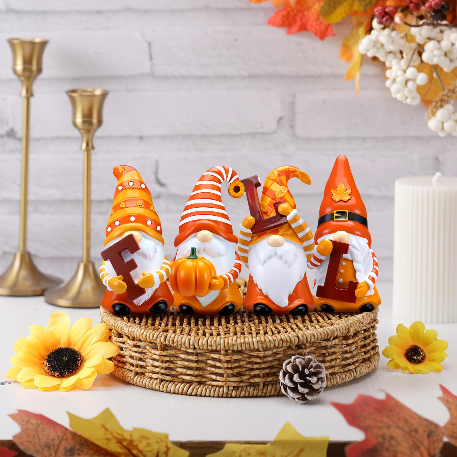 - Fall Gnome Decor: our fall gnome comes in 4 different designs with orange, yellow, and brown colors, and figures of the maple leaf, pumpkin, fall leaf, and sunflower elements; Each standing gnome holding one letter forming the word FALL to set a warm autumn mood