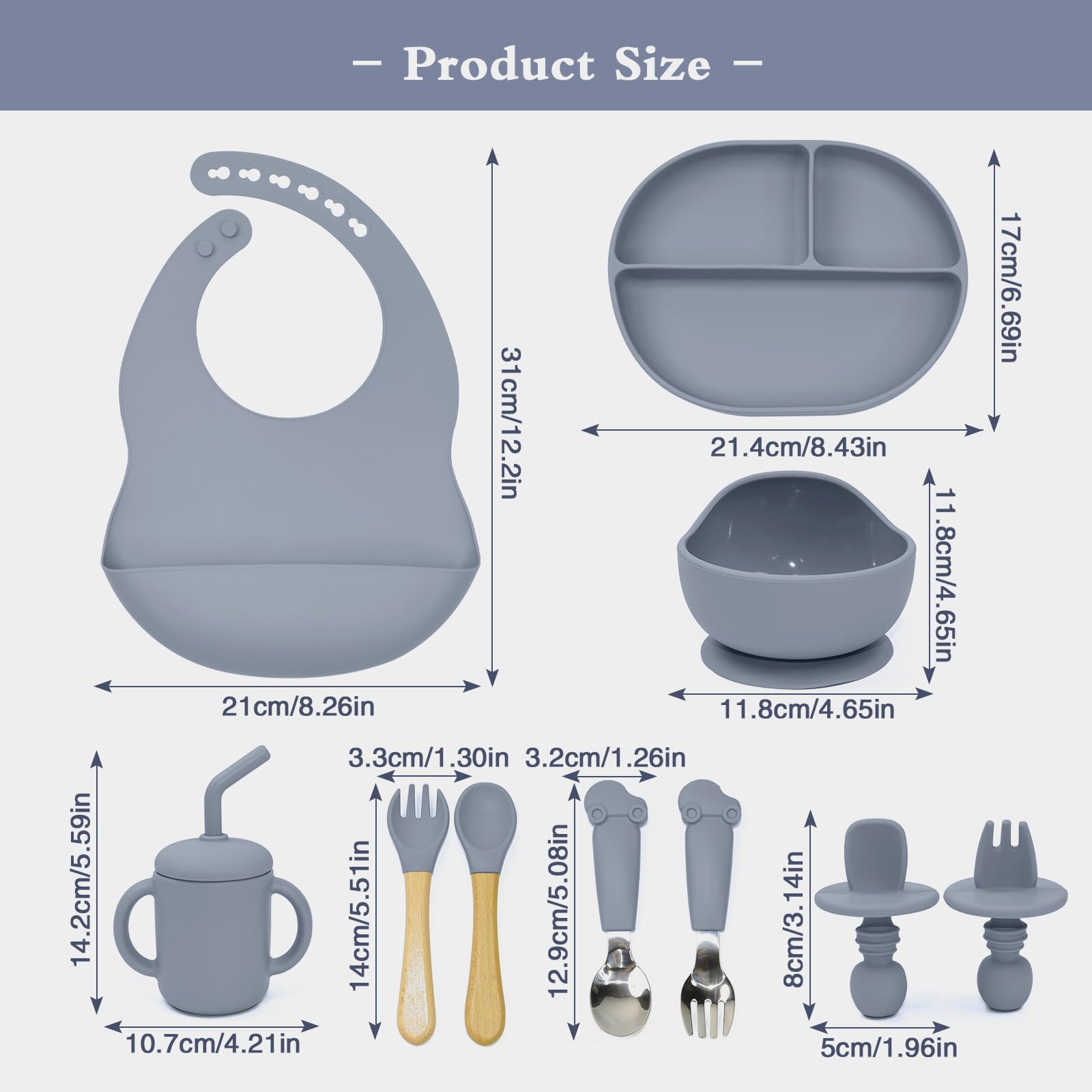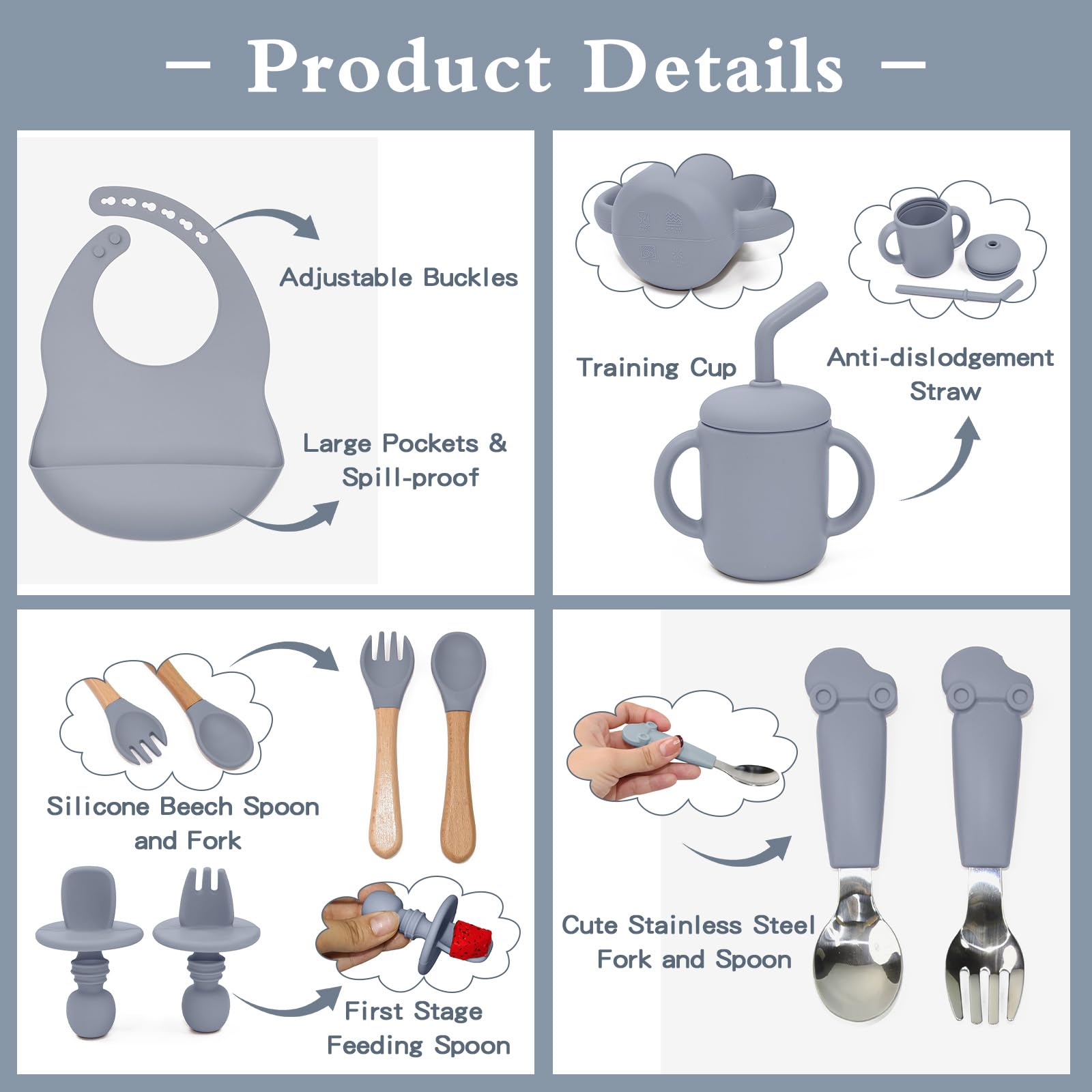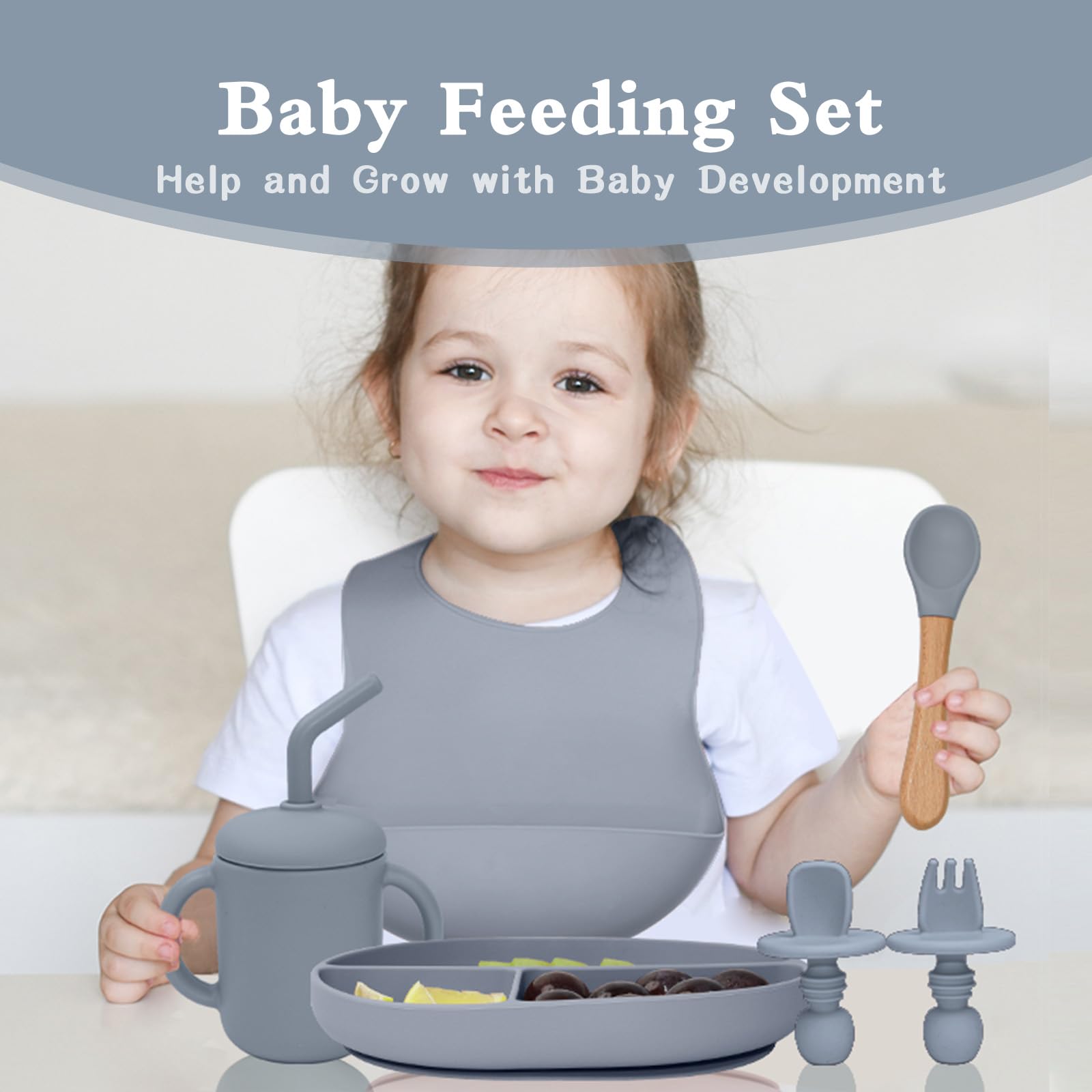 - 【Complete Baby Silicone Feeding Set】Comes with everything you need to start your baby on solid foods - adjustable bibs, baby suction plate and bowl, training sippy cup, and utensils. Makes this baby utensils 6-12 months a perfect baby gift!