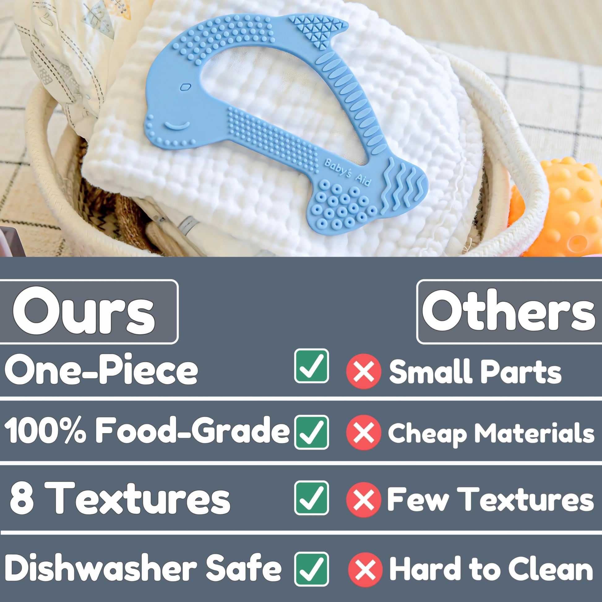 Silicone Baby Teether - Dolphin | 8 Teething Relief Textures, 100% Food-Grade, Easy to Hold & BPA Free Silicone Teethers for Babies, Baby Teething Toys, Soft Chew Toy for Babies Ages 3M+ - Baby’s Aid