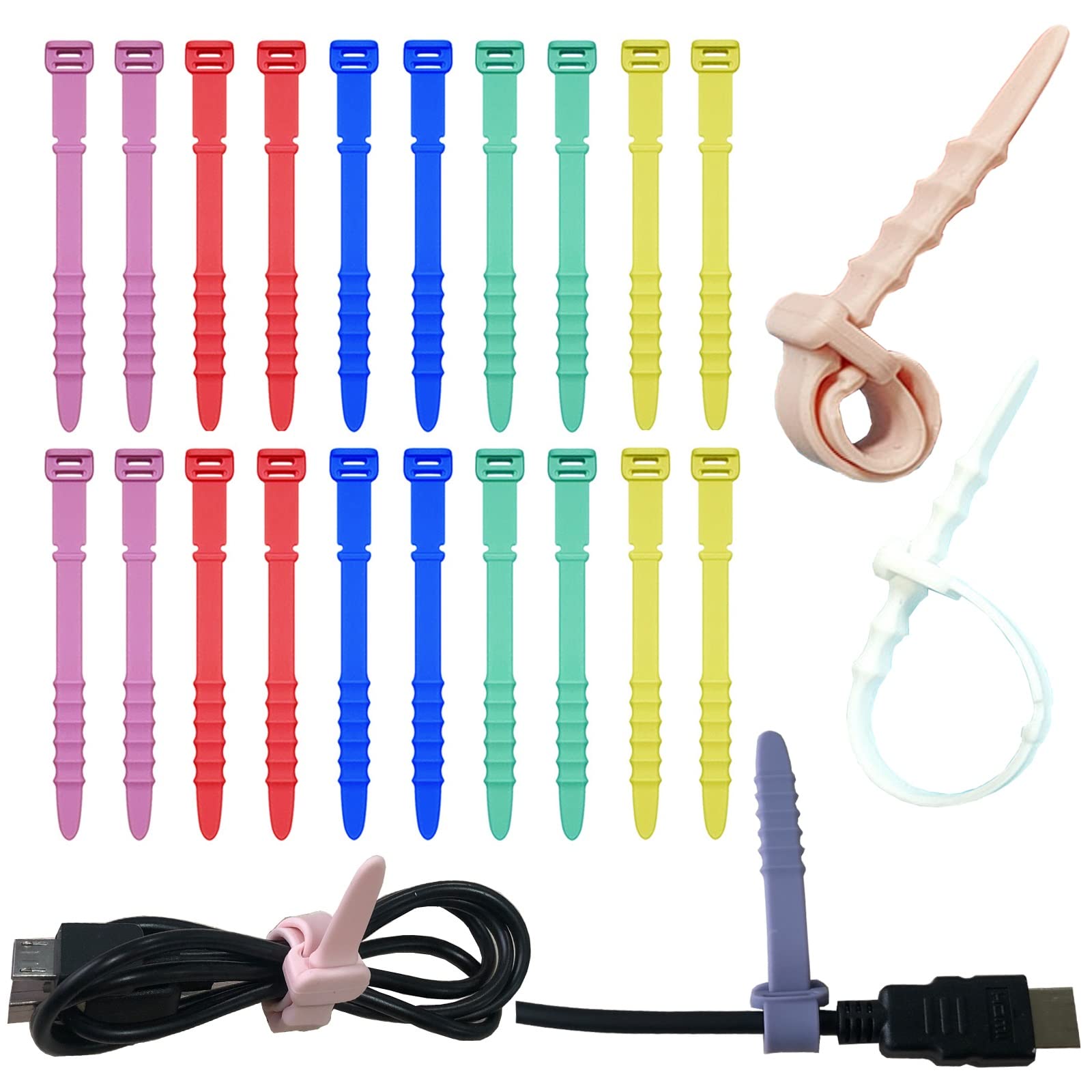 Silicone Zip Ties, Reusable Zip Ties, 20pcs Rubber Cable Ties Straps for Wire Management, Elastic Cable Organizer for Home Office Table Desk. 4.5” Cord Ties in White, Black, Pink, Purple and Blue