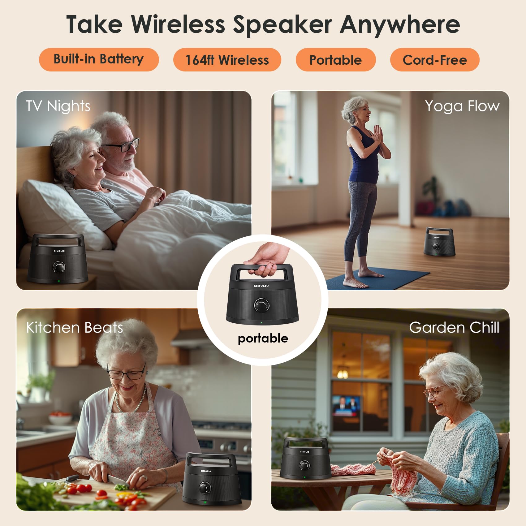 SIMOLIO Wireless TV Speakers for Seniors Hard of Hearing, 164ft Long Range, 3 EQ Modes, Voice Clarity Boost, Dual TV/Bluetooth Modes, Portable Rechargeable Speaker for TVs with Wired Headphones